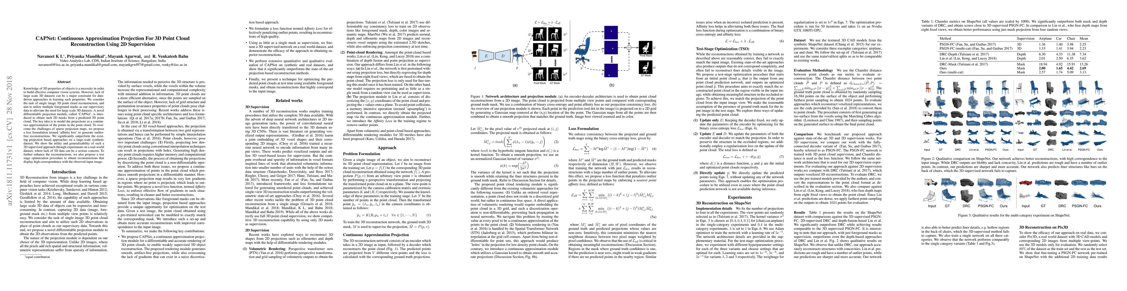 Knowledge of 3D properties of objects is a necessity in order to build effective computer vision systems. However, lack of large scale 3D datasets can be a major constraint for data-driven approaches in learning such properties. We consider the task of single image 3D point cloud reconstruction, and aim to utilize multiple foreground masks as our supervisory data to alleviate the need for large scale 3D datasets. A novel differentiable projection module, called 'CAPNet', is introduced to obtain such 2D masks from a predicted 3D point cloud. The key idea is to model the projections as a continuous approximation of the points in the point cloud. To overcome the challenges of sparse projection maps, we propose a loss formulation termed 'affinity loss' to generate outlier-free reconstructions. We significantly outperform the existing projection based approaches on a large-scale synthetic dataset. We show the utility and generalizability of such a 2D supervised approach through experiments on a real-world dataset, where lack of 3D data can be a serious concern. To further enhance the reconstructions, we also propose a test stage optimization procedure to obtain reconstructions that display high correspondence with the observed input image.