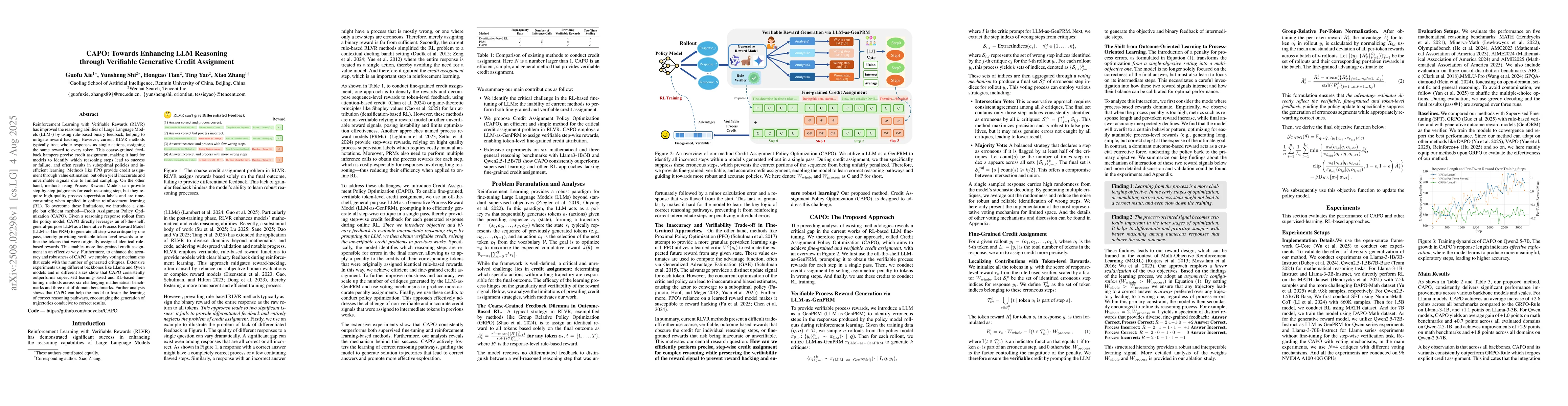 Reinforcement Learning with Verifiable Rewards (RLVR) has improved the reasoning abilities of Large Language Models (LLMs) by using rule-based binary feedback, helping to mitigate reward hacking. However, current RLVR methods typically treat whole responses as single actions, assigning the same reward to every token. This coarse-grained feedback hampers precise credit assignment, making it hard for models to identify which reasoning steps lead to success or failure, and often results in suboptimal policies and inefficient learning. Methods like PPO provide credit assignment through value estimation, but often yield inaccurate and unverifiable signals due to limited sampling. On the other hand, methods using Process Reward Models can provide step-by-step judgments for each reasoning step, but they require high-quality process supervision labels and are time-consuming when applied in online reinforcement learning (RL). To overcome these limitations, we introduce a simple but efficient method Credit Assignment Policy Optimization (CAPO). Given a reasoning response rollout from the policy model, CAPO directly leverages an off-the-shelf, general-purpose LLM as a Generative Process Reward Model (LLM-as-GenPRM) to generate all step-wise critique by one pass, thereby providing verifiable token-level rewards to refine the tokens that were originally assigned identical rule-based rewards. This enables more fine-grained credit assignment in an effective way. Furthermore, to enhance the accuracy and robustness of CAPO, we employ voting mechanisms that scale with the number of generated critiques. Extensive experiments using different backbones like Llama and Qwen models and in different sizes show that CAPO consistently outperforms supervised learning-based and RL-based fine-tuning methods across six challenging mathematical benchmarks and three out-of-domain benchmarks.