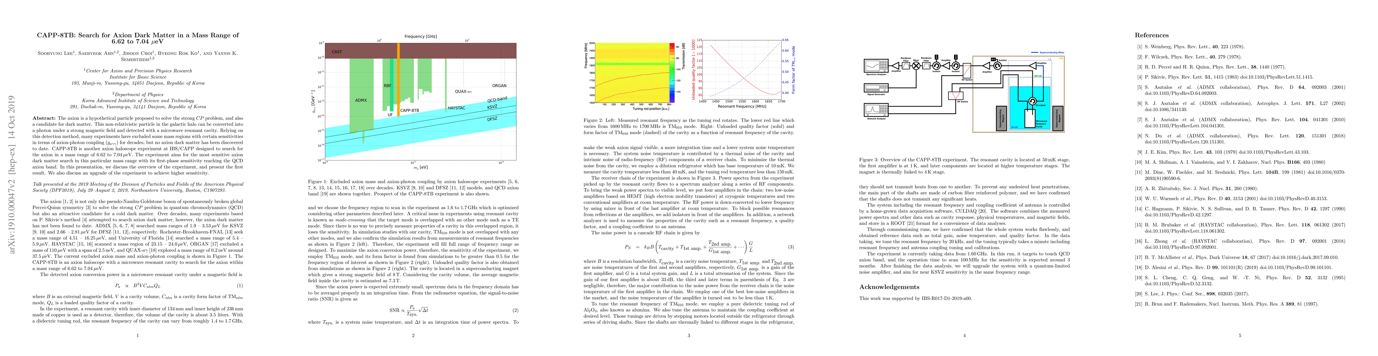 The CAPP-8TB experiment aims to detect axion dark matter in the mass range of 6.62 to 7.04 $\mu$eV using a microwave resonant cavity in a strong magnetic field. The first-phase results have reached the QCD axion band sensitivity, and an upgrade is planned for further improvements.