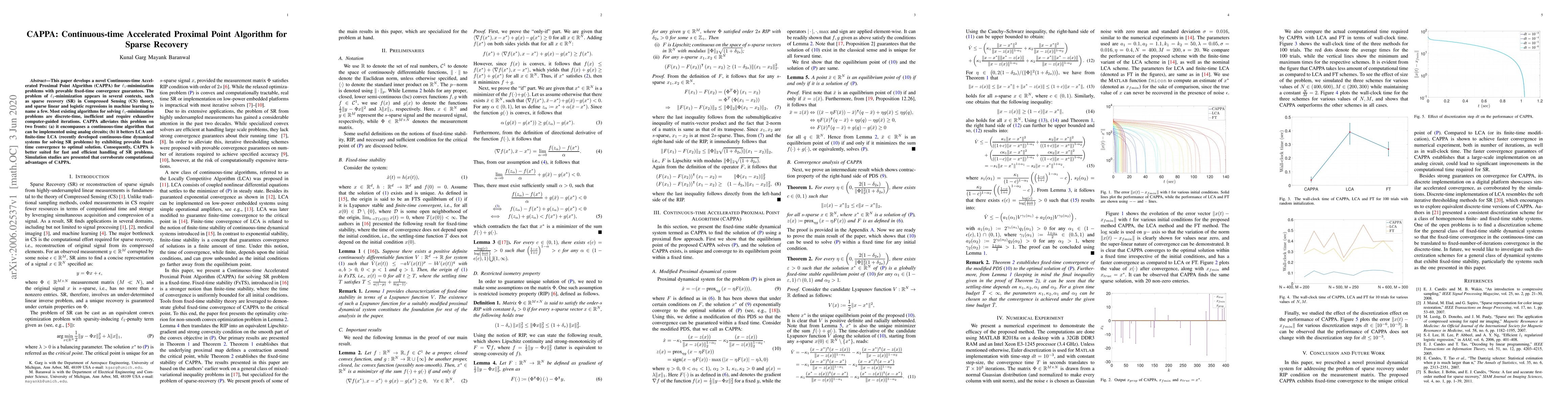 This paper develops a novel Continuous-time Accelerated Proximal Point Algorithm (CAPPA) for $\ell_1$-minimization problems with provable fixed-time convergence guarantees. The problem of $\ell_1$-minimization appears in several contexts, such as sparse recovery (SR) in Compressed Sensing (CS) theory, and sparse linear and logistic regressions in machine learning to name a few. Most existing algorithms for solving $\ell_1$-minimization problems are discrete-time, inefficient and require exhaustive computer-guided iterations. CAPPA alleviates this problem on two fronts: (a) it encompasses a continuous-time algorithm that can be implemented using analog circuits; (b) it betters LCA and finite-time LCA (recently developed continuous-time dynamical systems for solving SR problems) by exhibiting provable fixed-time convergence to optimal solution. Consequently, CAPPA is better suited for fast and efficient handling of SR problems. Simulation studies are presented that corroborate computational advantages of CAPPA.