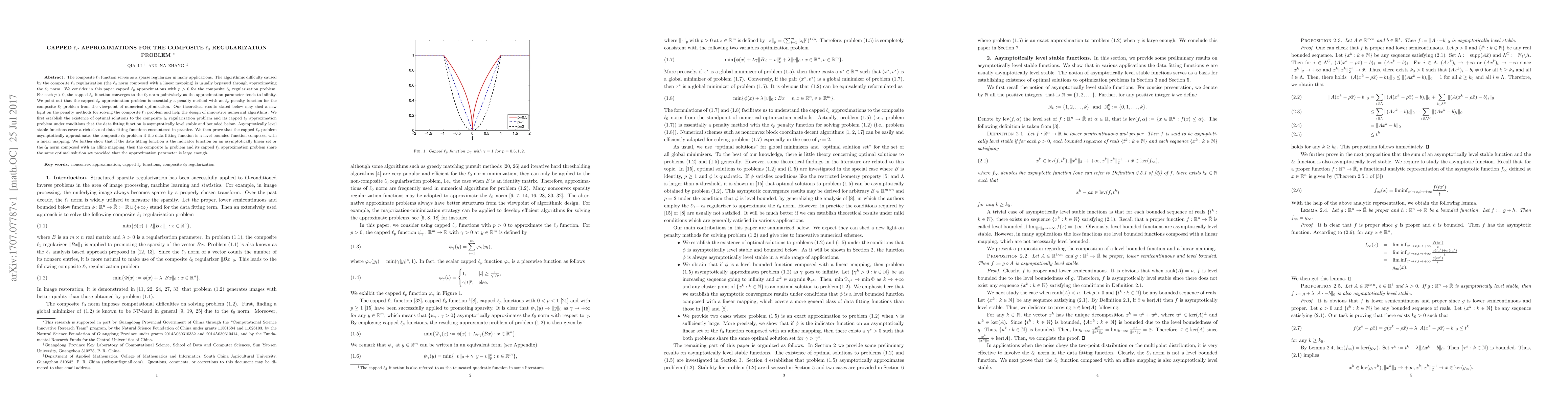 This paper explores capped Lp approximations for the composite L0 regularization problem, demonstrating their convergence to the L0 norm as the approximation parameter increases. It establishes the existence of optimal solutions and proves that the capped Lp problem asymptotically approximates the composite L0 problem under certain conditions.