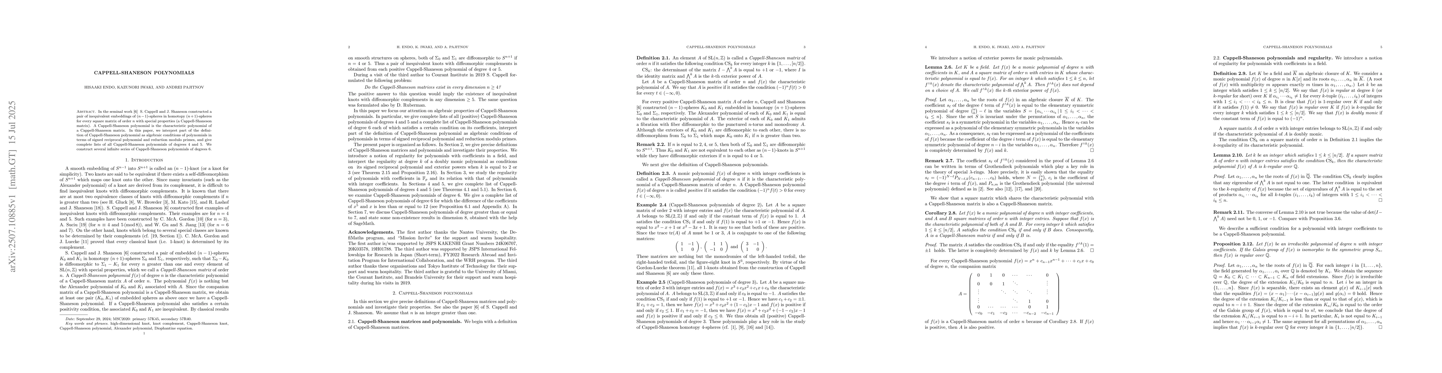 S. Cappell and J. Shaneson constructed a pair of inequivalent embeddings of $(n-1)$-spheres in homotopy $(n+1)$-spheres for every square matrix of order $n$ with special properties (a Cappell-Shaneson matrix). A Cappell-Shaneson polynomial is the characteristic polynomial of a Cappell-Shaneson matrix. In this paper, we interpret part of the definition of Cappell-Shaneson polynomial as algebraic conditions on polynomials in terms of signed reciprocal polynomial and reduction modulo primes, and give complete lists of all Cappell-Shaneson polynomials of degrees $4$ and $5$. We construct several infinite series of Cappell-Shaneson polynomials of degree $6$.