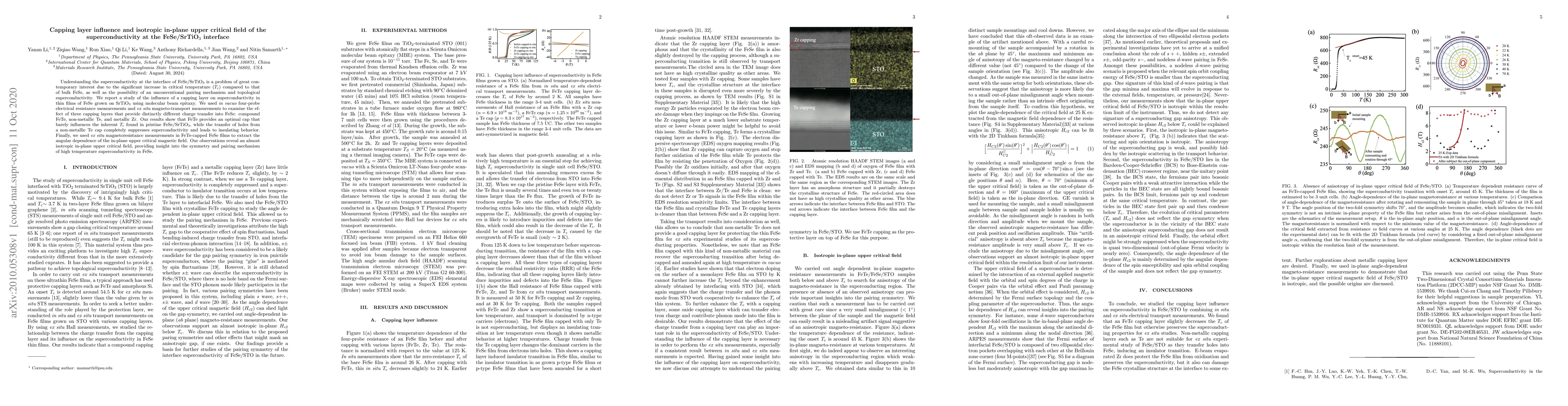 This study investigates the impact of different capping layers on superconductivity at the FeSe/SrTiO3 interface, revealing that FeTe capping maintains the intrinsic critical temperature while non-metallic Te suppresses superconductivity. Magneto-transport measurements show an almost isotropic in-plane upper critical field, suggesting insights into the symmetry and pairing mechanism of high-temperature superconductivity.