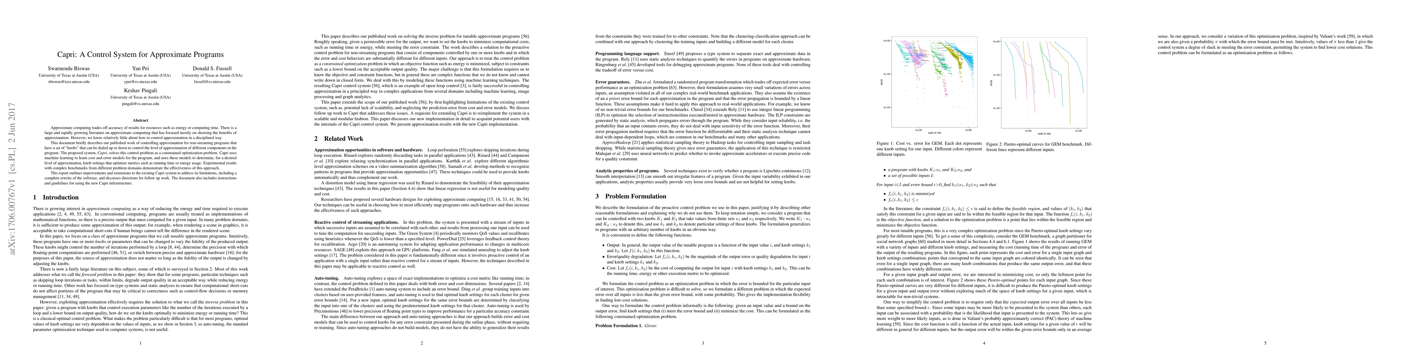 Approximate computing trades off accuracy of results for resources such as energy or computing time. There is a large and rapidly growing literature on approximate computing that has focused mostly on showing the benefits of approximation. However, we know relatively little about how to control approximation in a disciplined way. This document briefly describes our published work of controlling approximation for non-streaming programs that have a set of "knobs" that can be dialed up or down to control the level of approximation of different components in the program. The proposed system, Capri, solves this control problem as a constrained optimization problem. Capri uses machine learning to learn cost and error models for the program, and uses these models to determine, for a desired level of approximation, knob settings that optimize metrics such as running time or energy usage. Experimental results with complex benchmarks from different problem domains demonstrate the effectiveness of this approach. This report outlines improvements and extensions to the existing Capri system to address its limitations, including a complete rewrite of the software, and discusses directions for follow up work. The document also includes instructions and guidelines for using the new Capri infrastructure.
