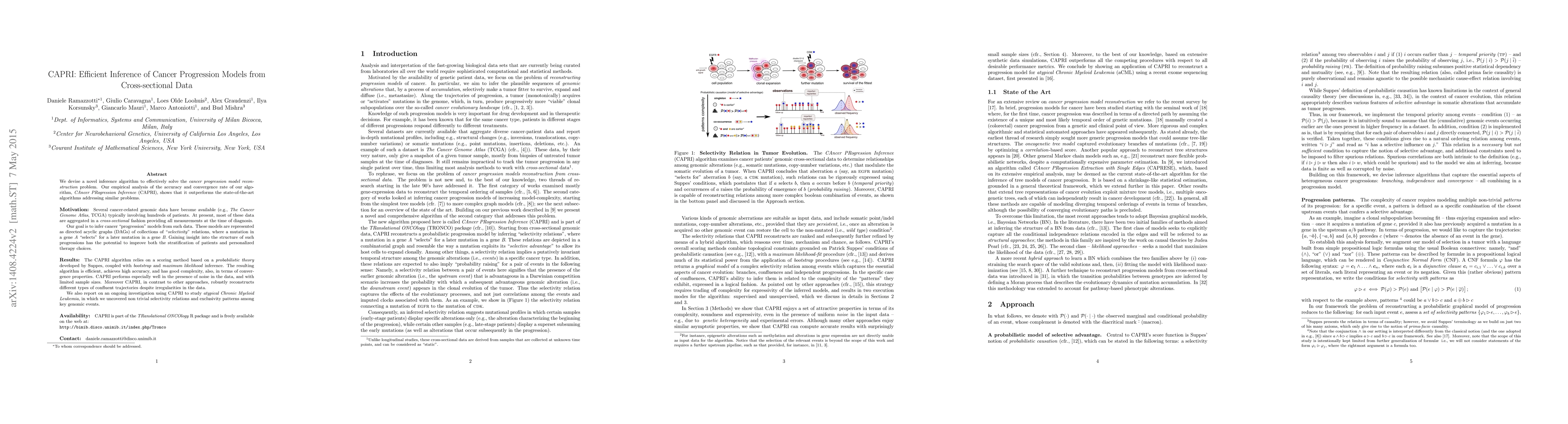 CAPRI is a novel algorithm designed to efficiently reconstruct cancer progression models from cross-sectional genomic data, outperforming existing methods in accuracy and convergence. The algorithm leverages a probabilistic scoring method and robustly handles noise and limited sample sizes, revealing significant genomic event relationships in studies like atypical Chronic Myeloid Leukemia.