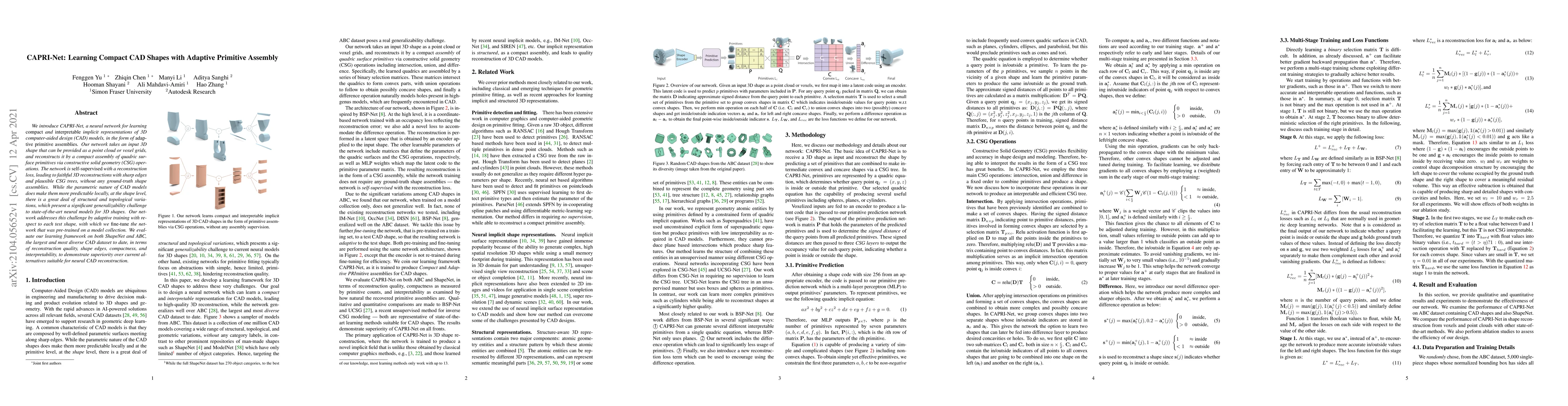 CAPRI-Net is a neural network designed to learn compact, interpretable implicit representations of 3D CAD models through adaptive primitive assemblies. It reconstructs 3D shapes using self-supervised training, demonstrating superior performance in reconstruction quality and interpretability compared to existing methods.