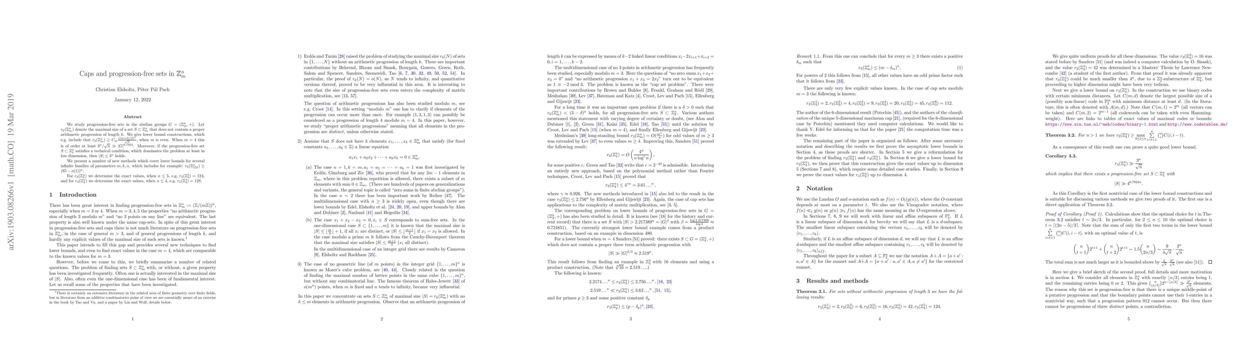This paper investigates progression-free sets in the group $\mathbb{Z}_m^n$ and provides lower bounds for their sizes, including $r_3(\mathbb{Z}_m^n) \geq C_m \frac{((m+2)/2)^n}{\sqrt{n}}$ for even $m$. It also determines exact values for specific small dimensions, such as $r_3(\mathbb{Z}_4^5)=124$ and $r_4(\mathbb{Z}_4^4)=128$.