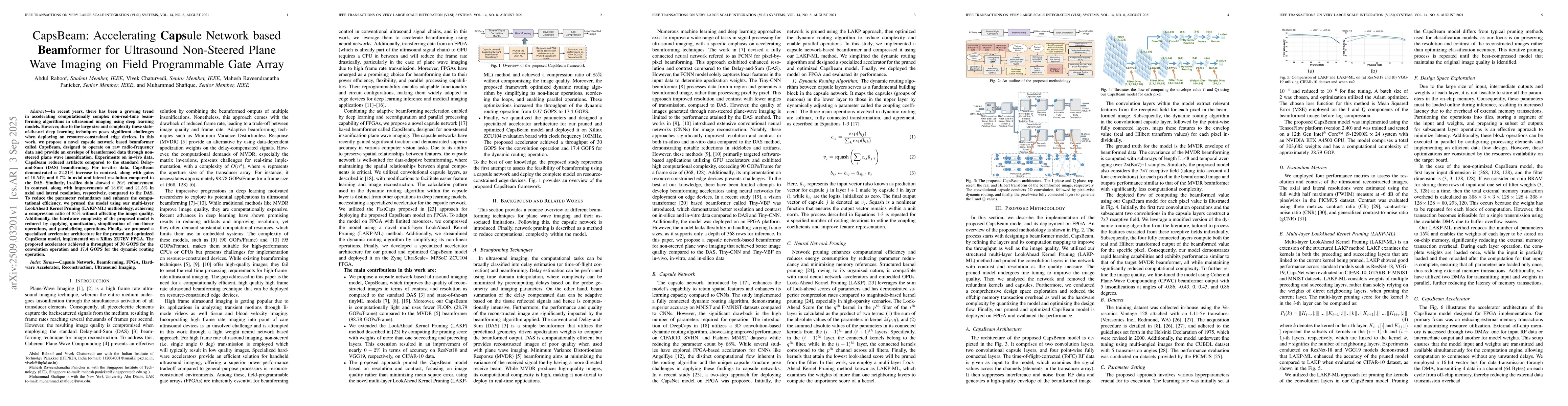 In recent years, there has been a growing trend in accelerating computationally complex non-real-time beamforming algorithms in ultrasound imaging using deep learning models. However, due to the large size and complexity these state-of-the-art deep learning techniques poses significant challenges when deploying on resource-constrained edge devices. In this work, we propose a novel capsule network based beamformer called CapsBeam, designed to operate on raw radio-frequency data and provide an envelope of beamformed data through non-steered plane wave insonification. Experiments on in-vivo data, CapsBeam reduced artifacts compared to the standard Delay-and-Sum (DAS) beamforming. For in-vitro data, CapsBeam demonstrated a 32.31% increase in contrast, along with gains of 16.54% and 6.7% in axial and lateral resolution compared to the DAS. Similarly, in-silico data showed a 26% enhancement in contrast, along with improvements of 13.6% and 21.5% in axial and lateral resolution, respectively, compared to the DAS. To reduce the parameter redundancy and enhance the computational efficiency, we pruned the model using our multi-layer LookAhead Kernel Pruning (LAKP-ML) methodology, achieving a compression ratio of 85% without affecting the image quality. Additionally, the hardware complexity of the proposed model is reduced by applying quantization, simplification of non-linear operations, and parallelizing operations. Finally, we proposed a specialized accelerator architecture for the pruned and optimized CapsBeam model, implemented on a Xilinx ZU7EV FPGA. The proposed accelerator achieved a throughput of 30 GOPS for the convolution operation and 17.4 GOPS for the dynamic routing operation.