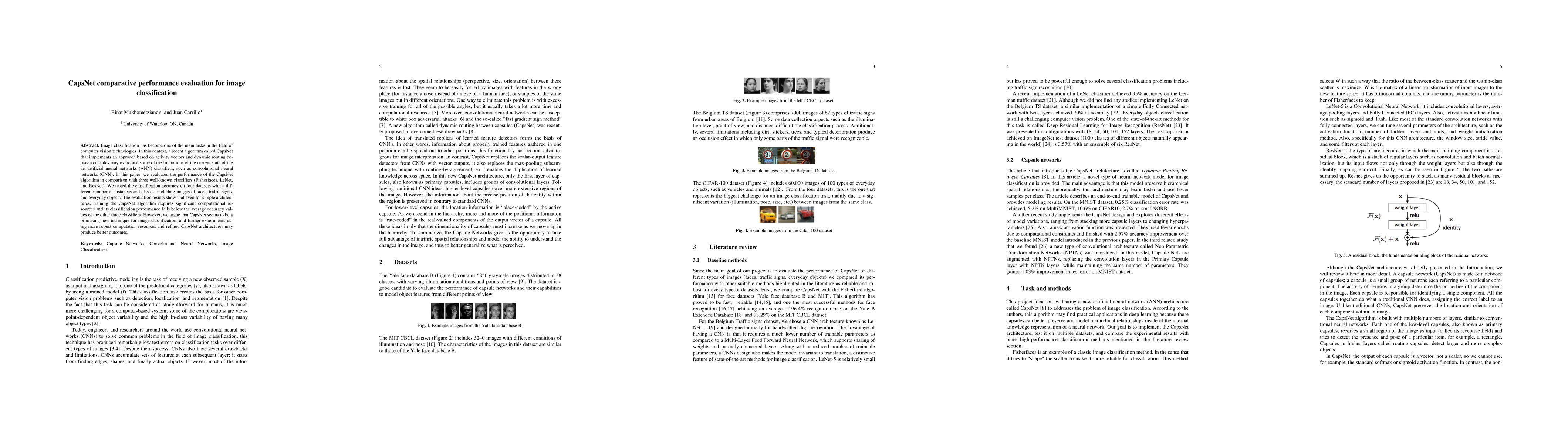 This paper evaluates CapsNet's performance for image classification against Fisher-faces, LeNet, and ResNet across four datasets. Despite requiring significant computational resources, CapsNet's accuracy falls below the other classifiers, suggesting potential for improvement with enhanced resources and refined architectures.