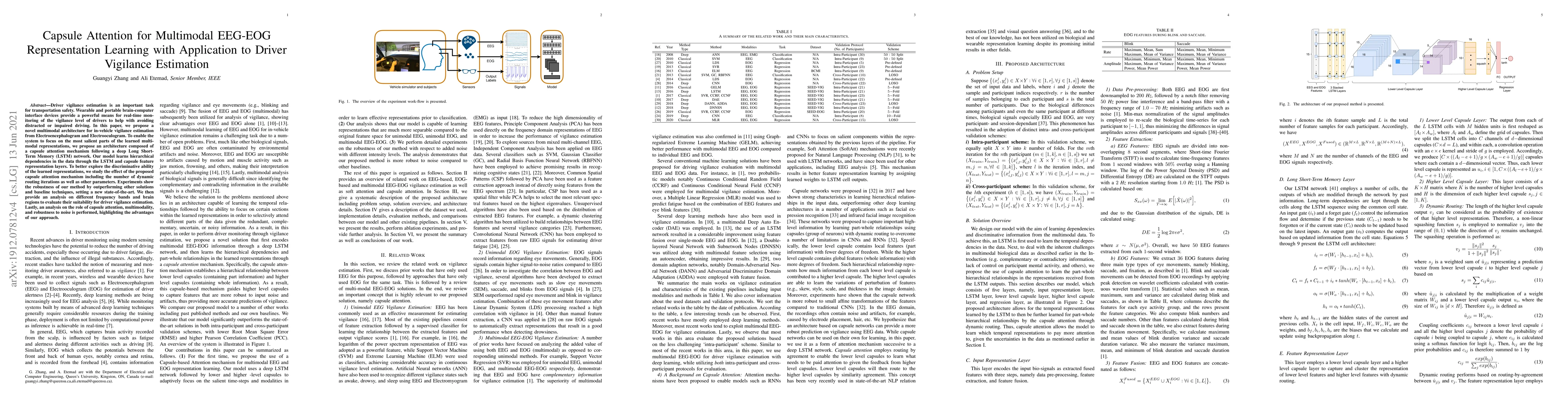 This paper proposes a novel multimodal EEG-EOG architecture for driver vigilance estimation using a capsule attention mechanism following a deep LSTM network, which outperforms other methods and sets a new state-of-the-art in real-time monitoring for transportation safety. The study also evaluates the effectiveness of different frequency bands and brain regions, and analyzes the role of capsule attention and multimodality.