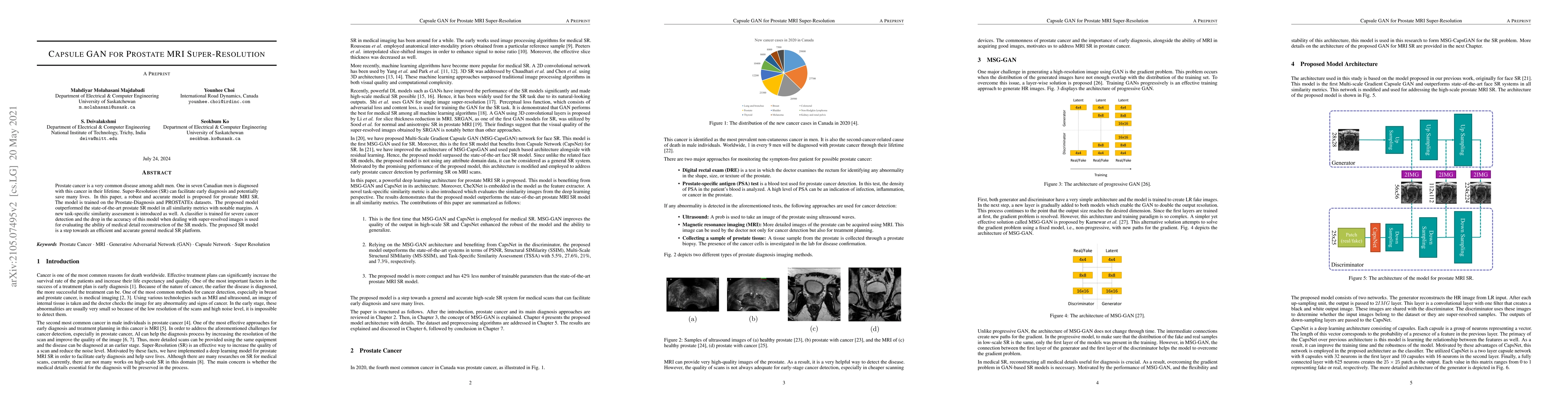 This paper proposes a Capsule GAN model for super-resolving prostate MRI images, significantly outperforming existing models in similarity metrics. The model is evaluated using a new task-specific similarity assessment and a classifier for severe cancer detection, demonstrating its potential for improving early prostate cancer diagnosis.