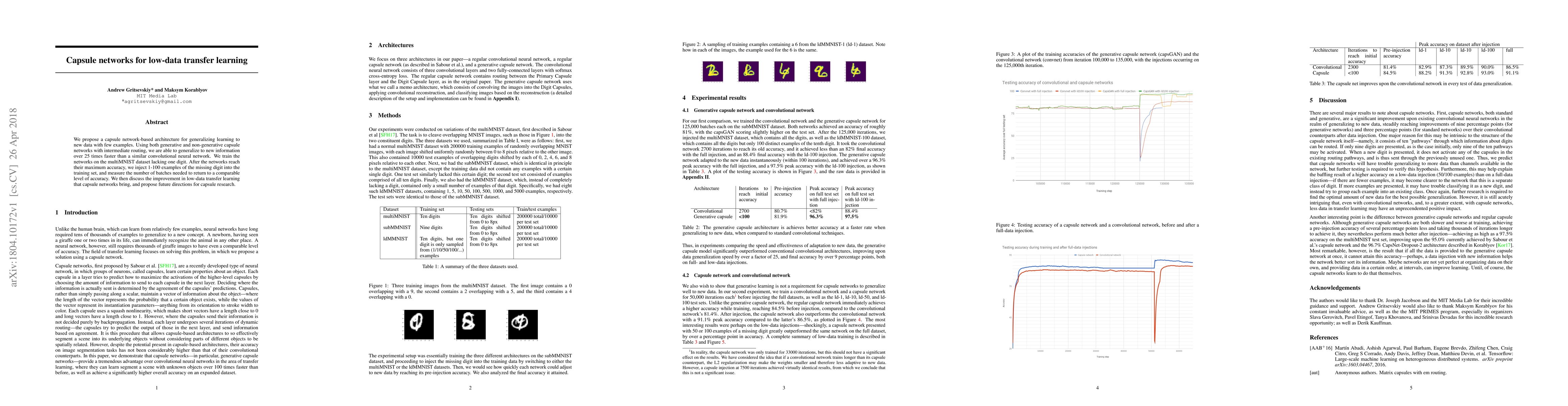 We propose a capsule network-based architecture for generalizing learning to new data with few examples. Using both generative and non-generative capsule networks with intermediate routing, we are able to generalize to new information over 25 times faster than a similar convolutional neural network. We train the networks on the multiMNIST dataset lacking one digit. After the networks reach their maximum accuracy, we inject 1-100 examples of the missing digit into the training set, and measure the number of batches needed to return to a comparable level of accuracy. We then discuss the improvement in low-data transfer learning that capsule networks bring, and propose future directions for capsule research.