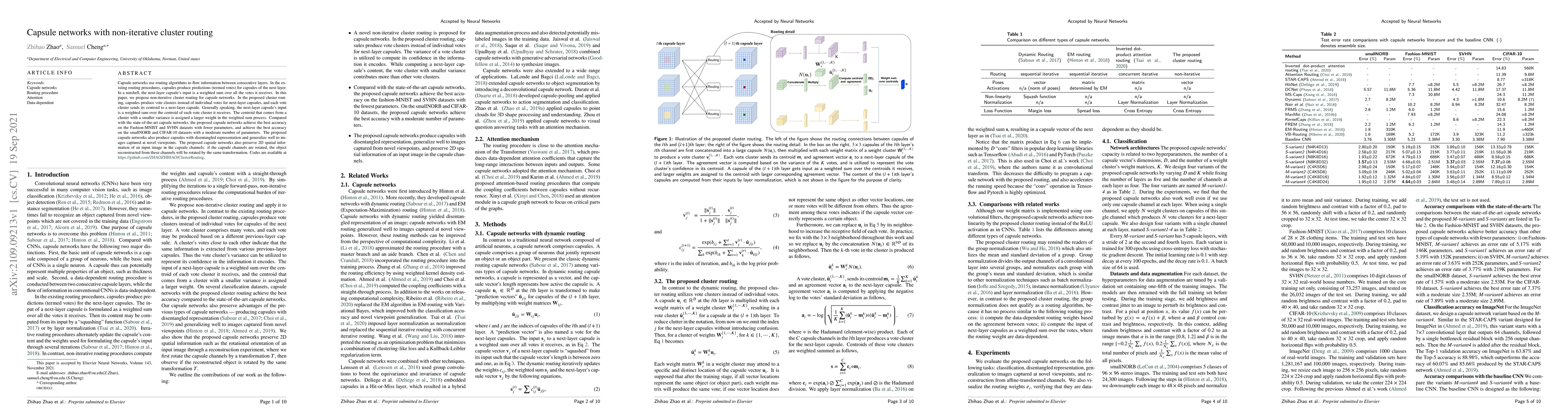 This paper proposes non-iterative cluster routing for capsule networks, where capsules send vote clusters instead of individual votes, with centroids weighted by variance. The method achieves state-of-the-art accuracy on several datasets with fewer parameters and preserves spatial information, leading to better generalization and disentangled representations.