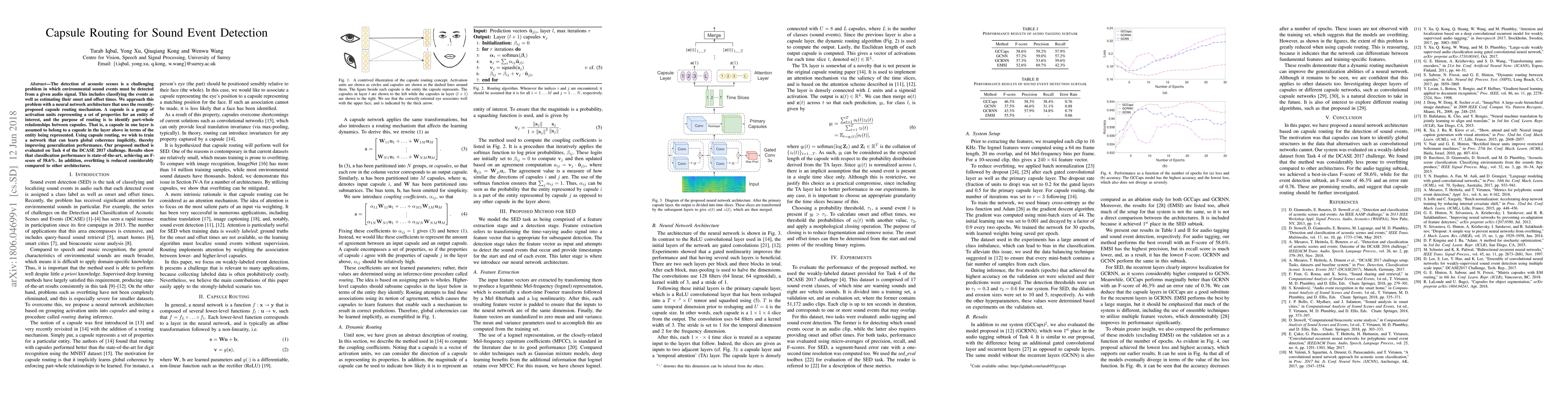 This paper proposes a neural network architecture using capsule routing for detecting sound events in audio signals, achieving state-of-the-art classification performance with an F-score of 58.6% and significantly reducing overfitting compared to other methods.