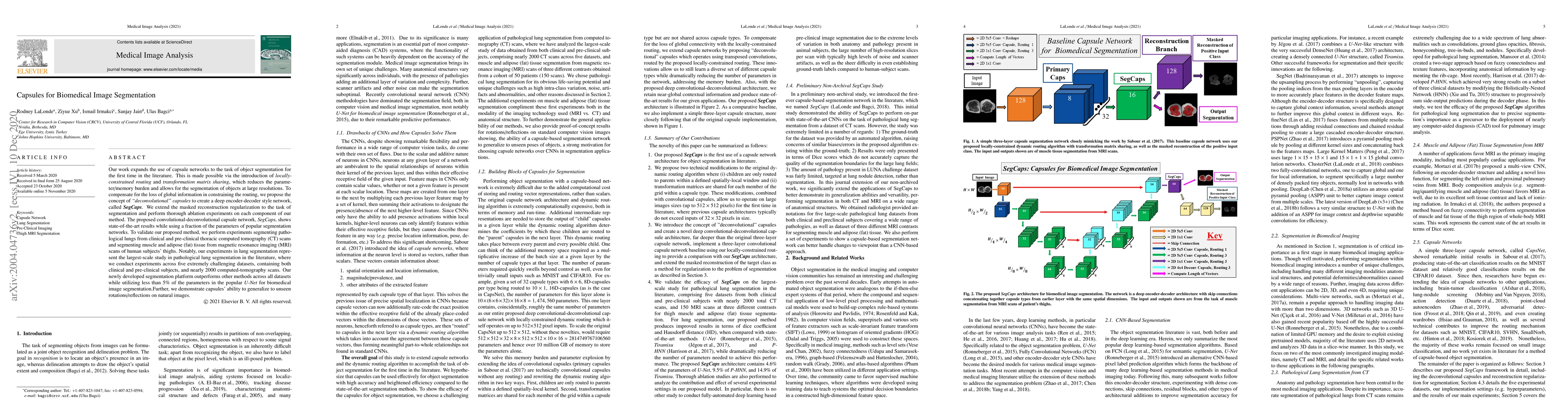 This paper introduces a new capsule network architecture, SegCaps, that achieves state-of-the-art results in biomedical image segmentation while using significantly fewer parameters than existing methods.