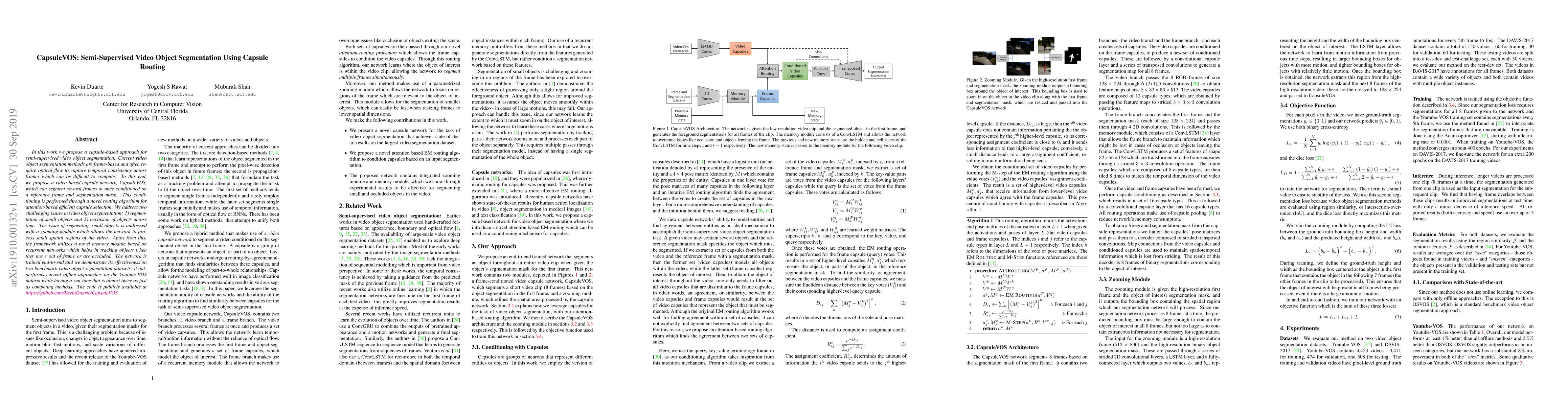 CapsuleVOS introduces a novel capsule network for semi-supervised video object segmentation, addressing small object segmentation and occlusion with a zooming module and memory module. It outperforms current offline methods on benchmark datasets while being significantly faster.