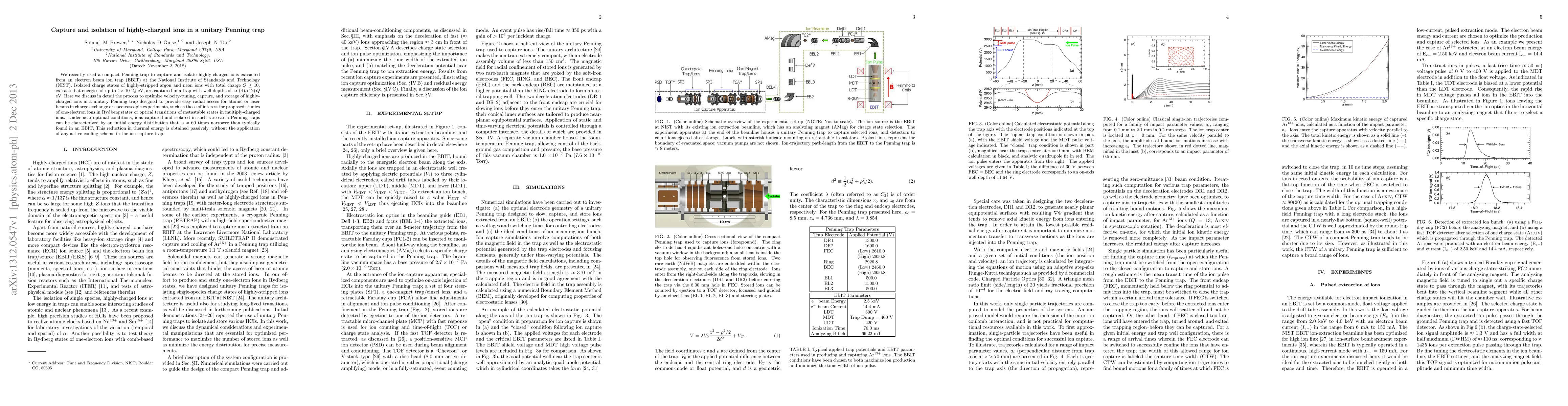 We recently used a compact Penning trap to capture and isolate highly-charged ions extracted from an electron beam ion trap (EBIT) at the National Institute of Standards and Technology (NIST). Isolated charge states of highly-stripped argon and neon ions with total charge $Q \geq 10$, extracted at energies of up to $4\times 10^3\,Q$ eV, are captured in a trap with well depths of $\,\approx (4\, {\rm to}\, 12)\,Q$ eV. Here we discuss in detail the process to optimize velocity-tuning, capture, and storage of highly-charged ions in a unitary Penning trap designed to provide easy radial access for atomic or laser beams in charge exchange or spectroscopic experiments, such as those of interest for proposed studies of one-electron ions in Rydberg states or optical transitions of metastable states in multiply-charged ions. Under near-optimal conditions, ions captured and isolated in such rare-earth Penning traps can be characterized by an initial energy distribution that is $\approx$ 60 times narrower than typically found in an EBIT. This reduction in thermal energy is obtained passively, without the application of any active cooling scheme in the ion-capture trap.