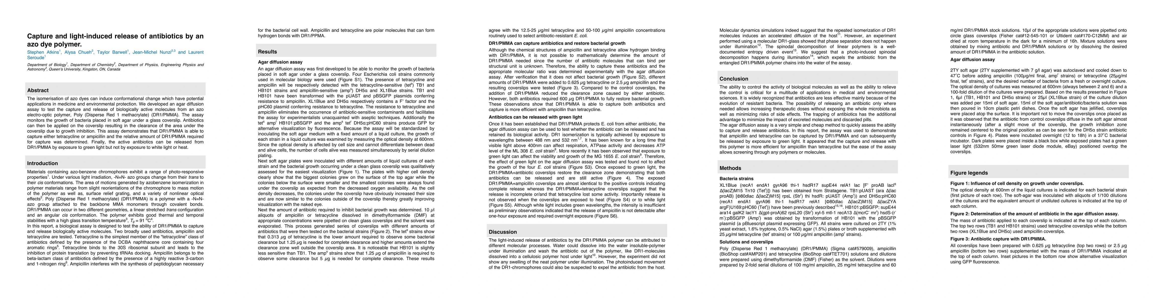 This study developed an agar diffusion assay to demonstrate the capture and light-induced release of antibiotics by an azo dye polymer, Poly (Disperse Red 1 methacrylate). The polymer effectively captures tetracycline or ampicillin and releases the antibiotics upon exposure to green light, showing potential for medical applications.