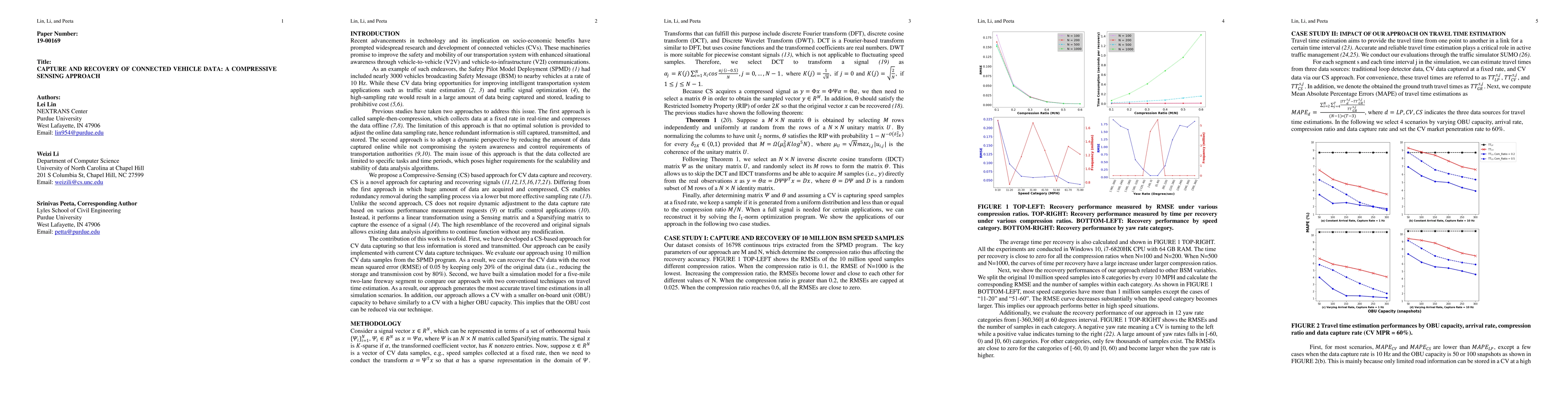 This paper proposes a compressive sensing approach for capturing and recovering connected vehicle data to manage data overload, demonstrating its effectiveness through two case studies on speed data recovery and travel time estimation in congested traffic. The results show significant savings in onboard unit costs and improved travel time estimation accuracy.