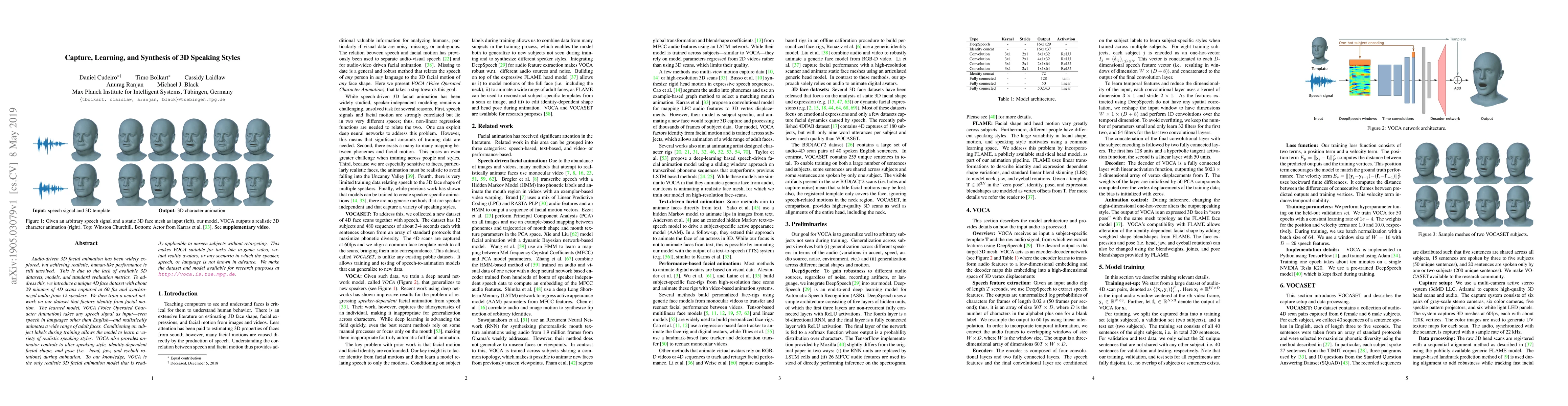 This paper introduces a 4D face dataset and a neural network model called VOCA for realistic 3D facial animation driven by any speech signal, including languages other than English. VOCA can animate a variety of speaking styles and provides controls for animators to adjust facial features and poses.