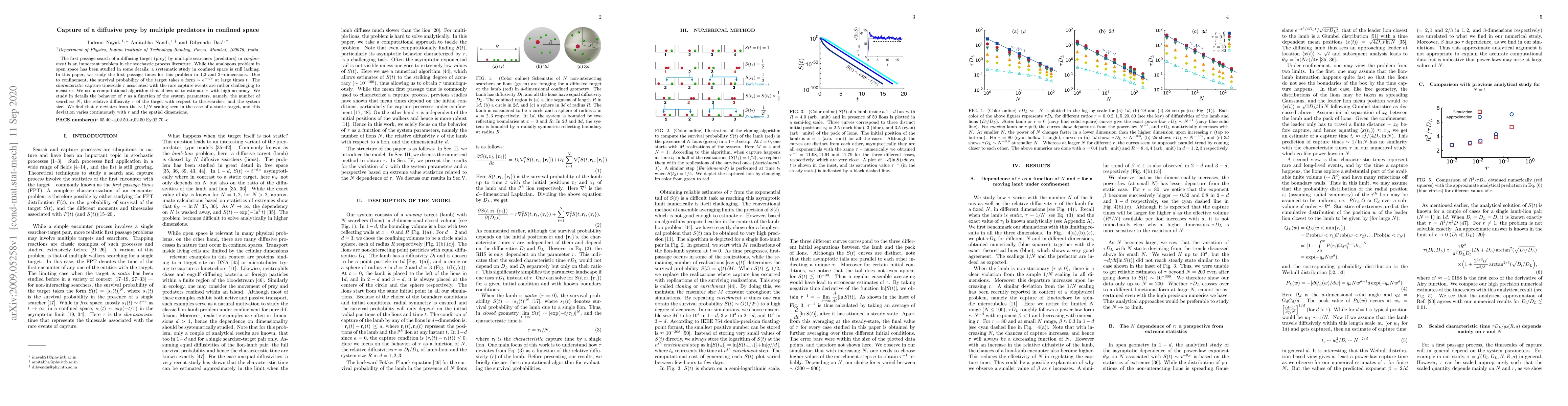 The first passage search of a diffusing target (prey) by multiple searchers (predators) in confinement is an important problem in the stochastic process literature. While the analogous problem in open space has been studied in some details, a systematic study in confined space is still lacking. In this paper, we study the first passage times for this problem in 1,2 and $3-$dimensions. Due to confinement, the survival probability of the target takes a form $\sim e^{-t/\tau}$ at large times $t$. The characteristic capture timescale $\tau$ associated with the rare capture events are rather challenging to measure. We use a computational algorithm that allows us to estimate $\tau$ with high accuracy. We study in details the behavior of $\tau$ as a function of the system parameters, namely, the number of searchers $N$, the relative diffusivity $r$ of the target with respect to the searcher, and the system size. We find that $\tau$ deviates from the $\sim 1/N$ scaling seen in the case of a static target, and this deviation varies continuously with $r$ and the spatial dimensions.