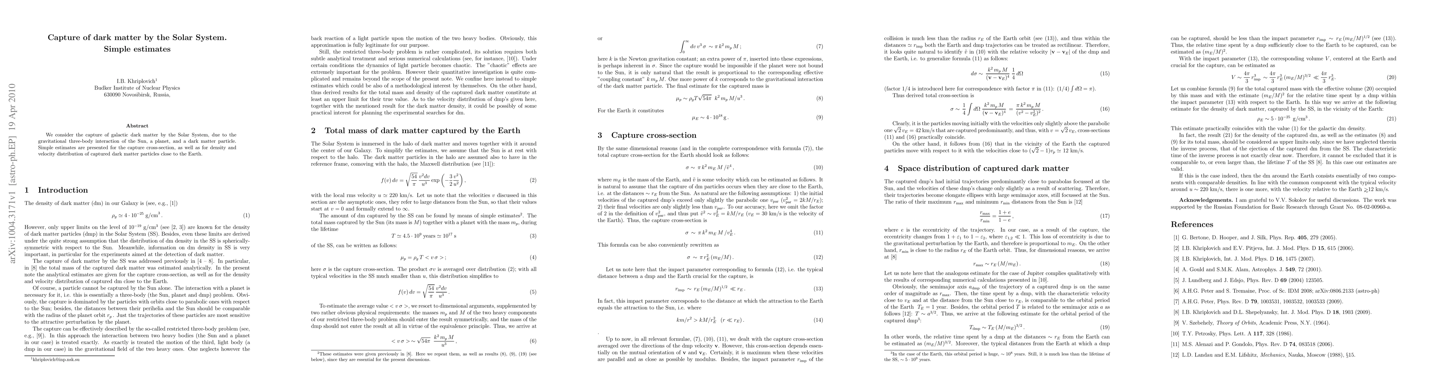 This paper estimates the capture of galactic dark matter by the Solar System through gravitational interactions involving the Sun, a planet, and dark matter particles. It provides simple calculations for the capture cross-section and the density and velocity distribution of dark matter near the Earth.
