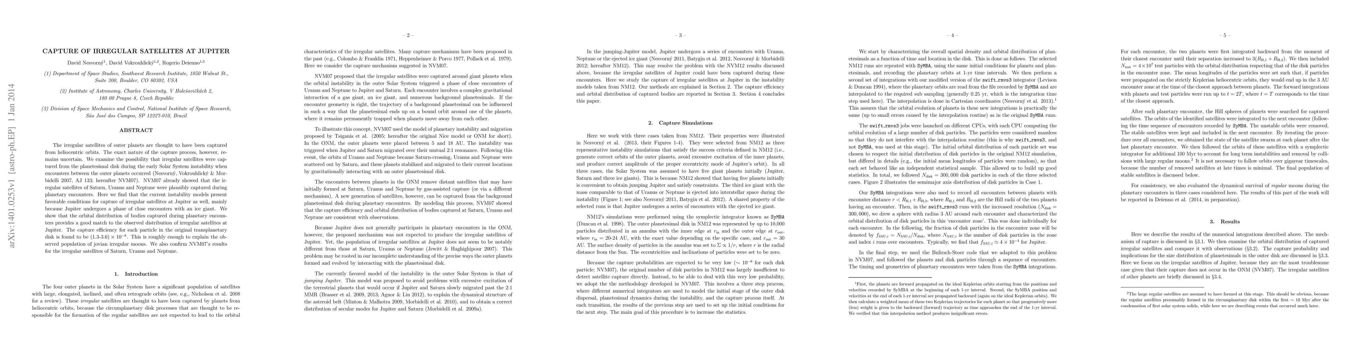This study investigates the capture of Jupiter's irregular satellites during the early Solar System's instability, finding that planetary encounters provide favorable conditions for capture. The orbital distribution of captured bodies matches observed irregular satellites, supporting the theory that these moons were likely captured during such encounters.