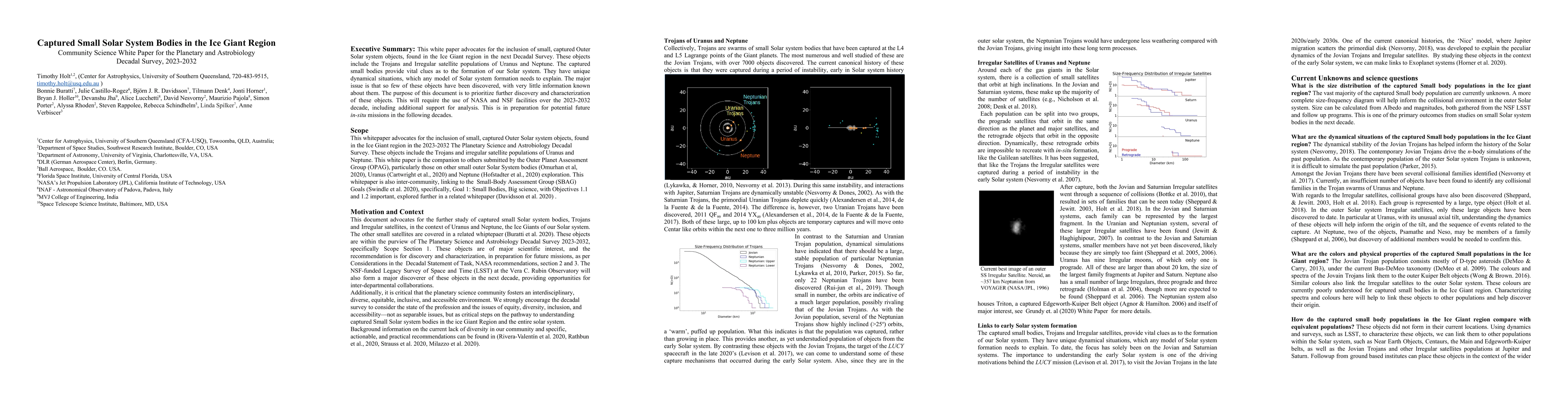 This white paper advocates for the inclusion of small, captured Outer Solar system objects, found in the Ice Giant region in the next Decadal Survey. These objects include the Trojans and Irregular satellite populations of Uranus and Neptune. The captured small bodies provide vital clues as to the formation of our Solar system. They have unique dynamical situations, which any model of Solar system formation needs to explain. The major issue is that so few of these objects have been discovered, with very little information known about them. The purpose of this document is to prioritize further discovery and characterization of these objects. This will require the use of NASA and NSF facilities over the 2023 2032 decade, including additional support for analysis. This is in preparation for potential future insitu missions in the following decades.