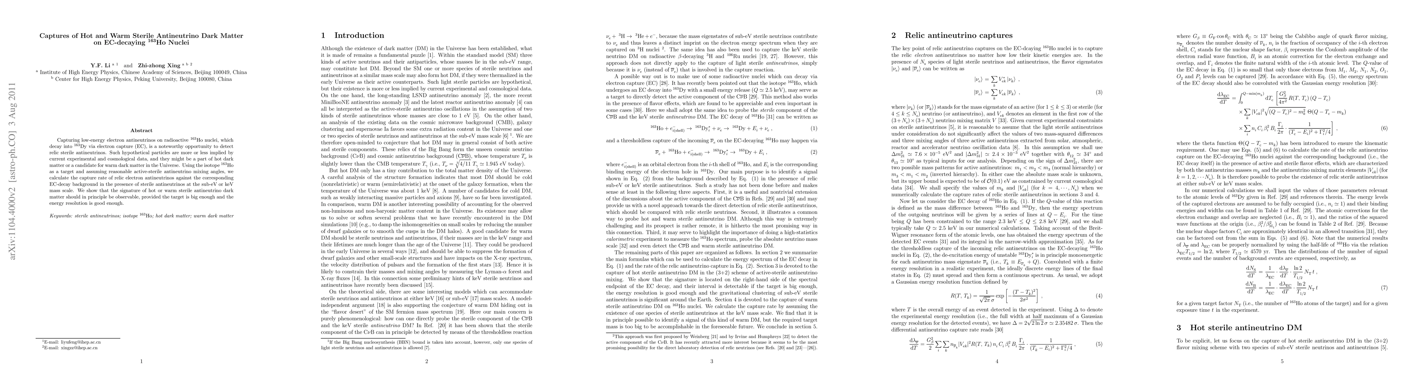Capturing low-energy electron antineutrinos on radioactive Ho-163 nuclei, which decay into Dy-163 via electron capture (EC), is a noteworthy opportunity to detect relic sterile antineutrinos. Such hypothetical particles are more or less implied by current experimental and cosmological data, and they might be a part of hot dark matter or a candidate for warm dark matter in the Universe. Using the isotope Ho-163 as a target and assuming reasonable active-sterile antineutrino mixing angles, we calculate the capture rate of relic electron antineutrinos against the corresponding EC-decay background in the presence of sterile antineutrinos at the sub-eV or keV mass scale. We show that the signature of hot or warm sterile antineutrino dark matter should in principle be observable, provided the target is big enough and the energy resolution is good enough.