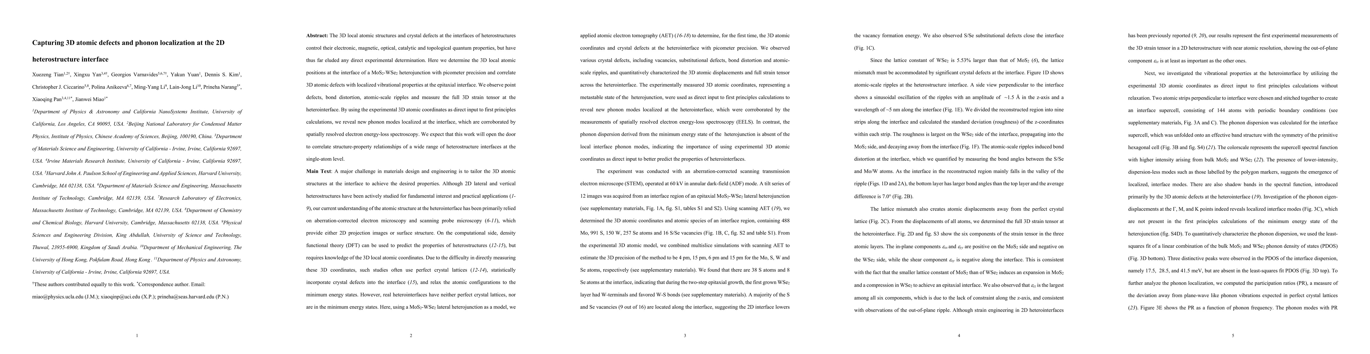 This research determines the 3D atomic positions and defects at the interface of MoS2-WSe2 heterostructures with high precision, revealing localized phonon modes and strain tensors, which could advance understanding of heterostructure properties. The findings provide a foundation for correlating atomic-level structure with material properties in various heterostructures.