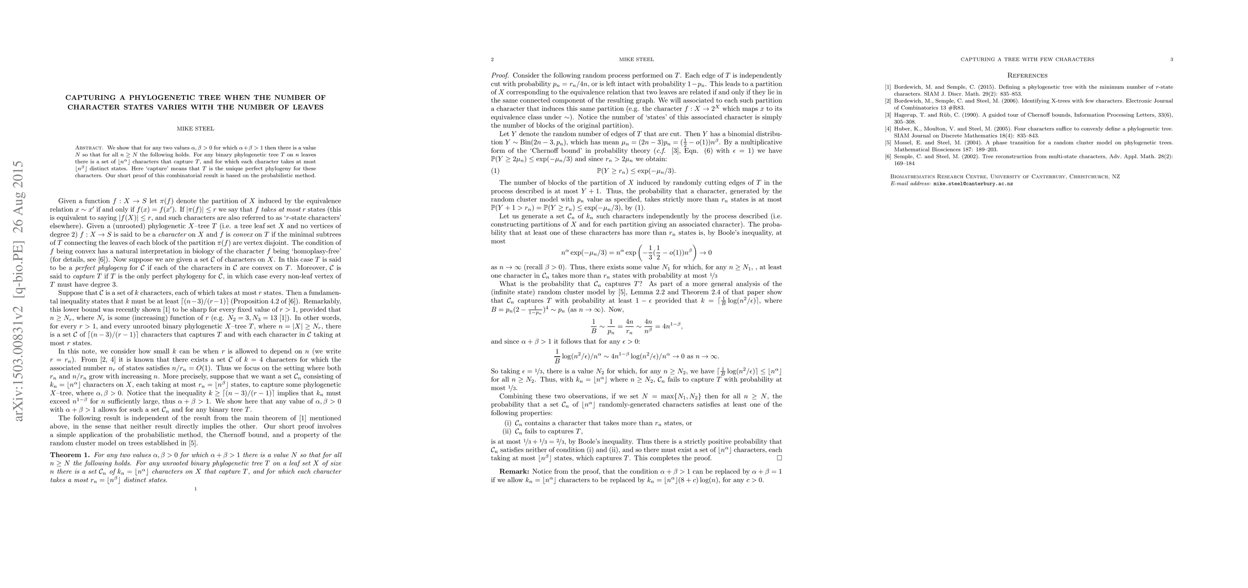 For binary phylogenetic trees on n leaves, a set of characters can capture the tree if there are enough distinct states to represent each branch, with the number of character states growing slower than the square root of n.