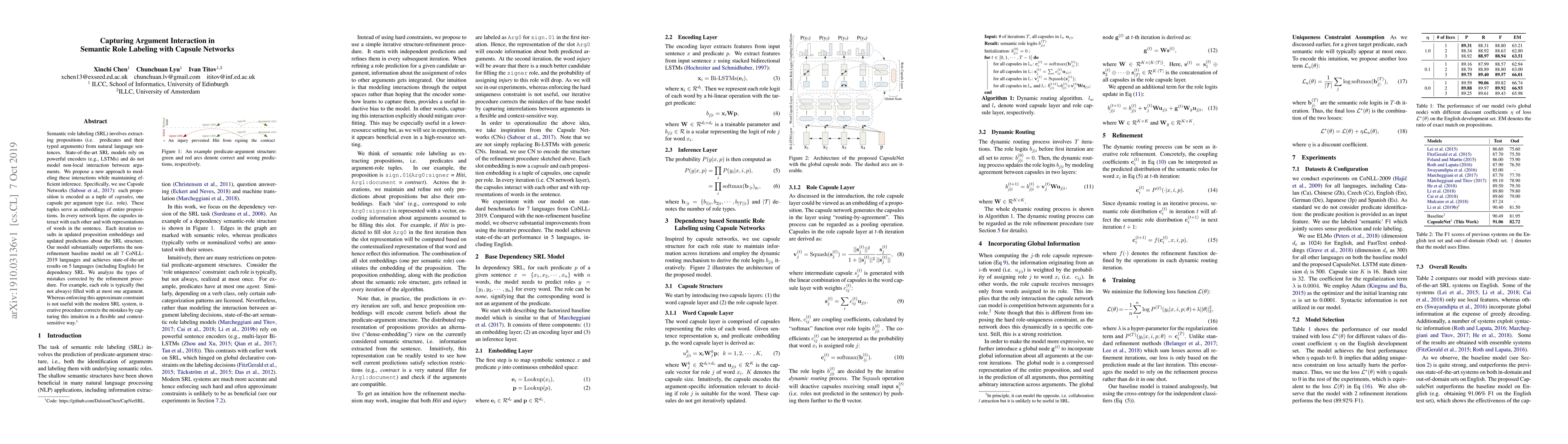 This paper proposes using Capsule Networks to model interactions between arguments in Semantic Role Labeling (SRL) to improve performance. The model iteratively refines argument embeddings and predictions, achieving state-of-the-art results on several languages by correcting common mistakes through context-sensitive constraint enforcement.