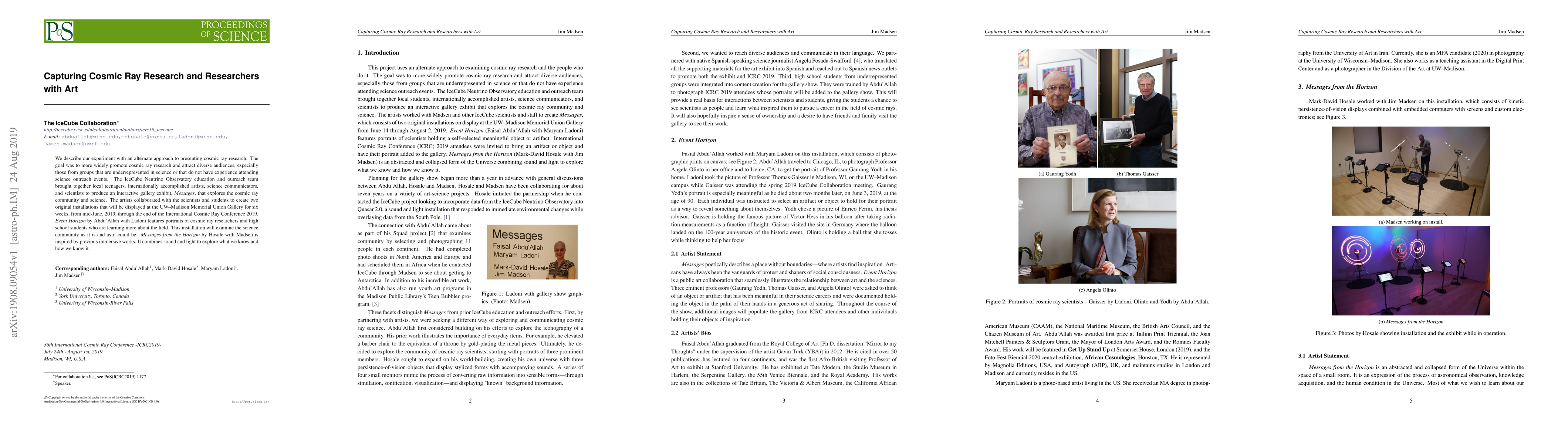 We describe our experiment with an alternate approach to presenting cosmic ray research. The goal was to more widely promote cosmic ray research and attract diverse audiences, especially those from groups that are underrepresented in science or that do not have experience attending science outreach events. The IceCube Neutrino Observatory education and outreach team brought together local teenagers, internationally accomplished artists, science communicators, and scientists to produce an interactive gallery exhibit, Messages, that explores the cosmic ray community and science. The artists collaborated with the scientists and students to create two original installations that will be displayed at the UW-Madison Memorial Union Gallery for six weeks, from mid-June, 2019, through the end of the International Cosmic Ray Conference 2019. Event Horizon by Abdu'Allah with Ladoni features portraits of cosmic ray researchers and high school students who are learning more about the field. This installation will examine the science community as it is and as it could be. Messages from the Horizon by Hosale with Madsen is inspired by previous immersive works. It combines sound and light to explore what we know and how we know it.