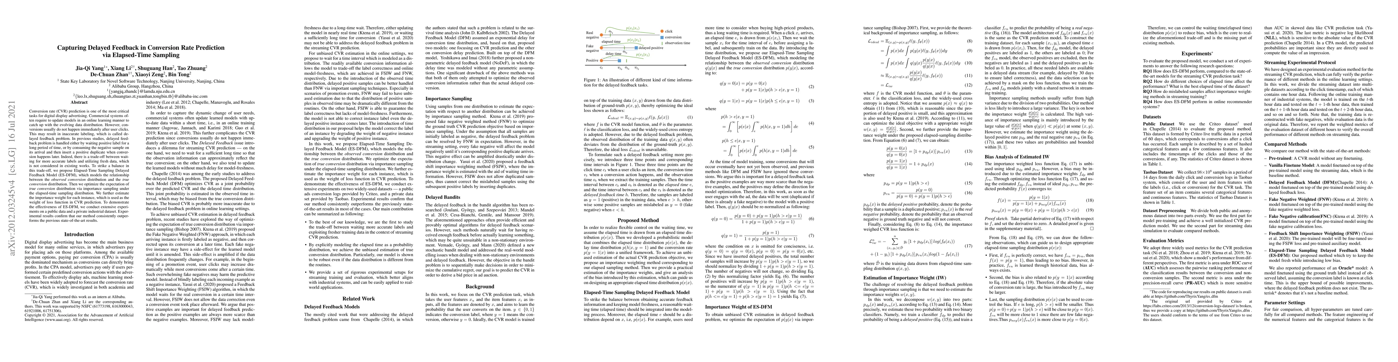 The paper proposes the Elapsed-Time Sampling Delayed Feedback Model (ES-DFM) to address the delayed feedback problem in conversion rate prediction, balancing the trade-off between waiting for accurate labels and using fresh data. Experimental results show that ES-DFM outperforms previous methods on both public and industrial datasets.
