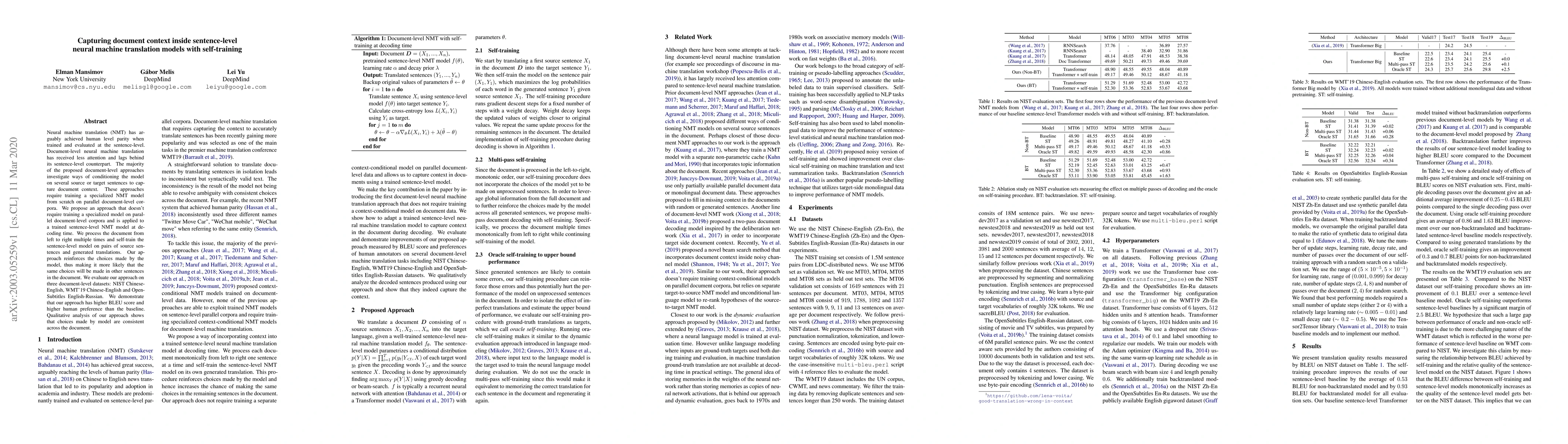 This paper introduces a method to enhance sentence-level neural machine translation (NMT) models with document context without requiring specialized training, by self-training on pairs of source and generated translations. The approach shows improved BLEU scores and human preference on several document-level datasets.