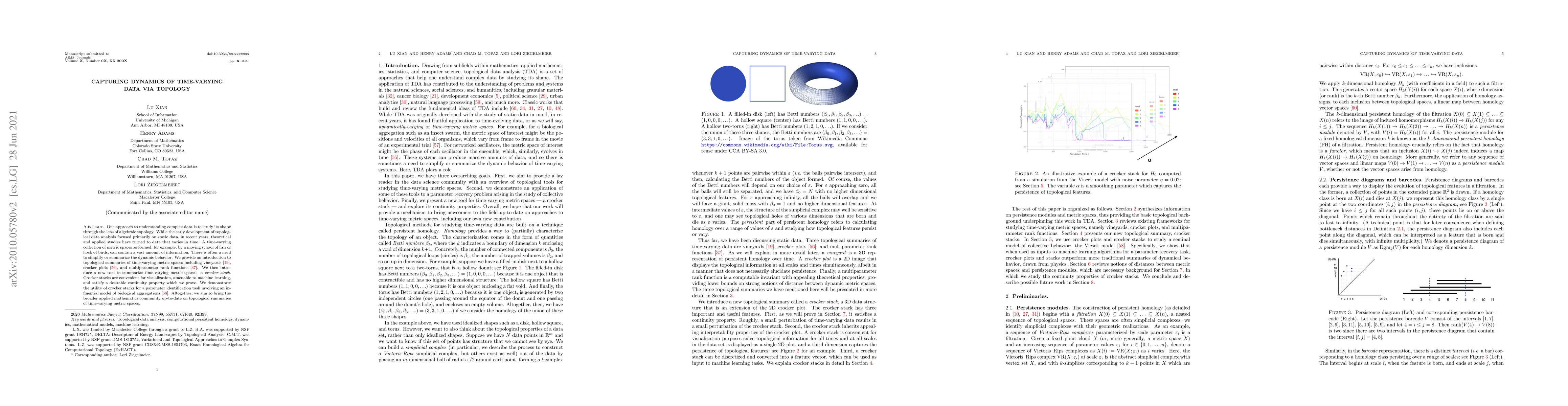 One approach to understanding complex data is to study its shape through the lens of algebraic topology. While the early development of topological data analysis focused primarily on static data, in recent years, theoretical and applied studies have turned to data that varies in time. A time-varying collection of metric spaces as formed, for example, by a moving school of fish or flock of birds, can contain a vast amount of information. There is often a need to simplify or summarize the dynamic behavior. We provide an introduction to topological summaries of time-varying metric spaces including vineyards [19], crocker plots [56], and multiparameter rank functions [37]. We then introduce a new tool to summarize time-varying metric spaces: a crocker stack. Crocker stacks are convenient for visualization, amenable to machine learning, and satisfy a desirable continuity property which we prove. We demonstrate the utility of crocker stacks for a parameter identification task involving an influential model of biological aggregations [58]. Altogether, we aim to bring the broader applied mathematics community up-to-date on topological summaries of time-varying metric spaces.