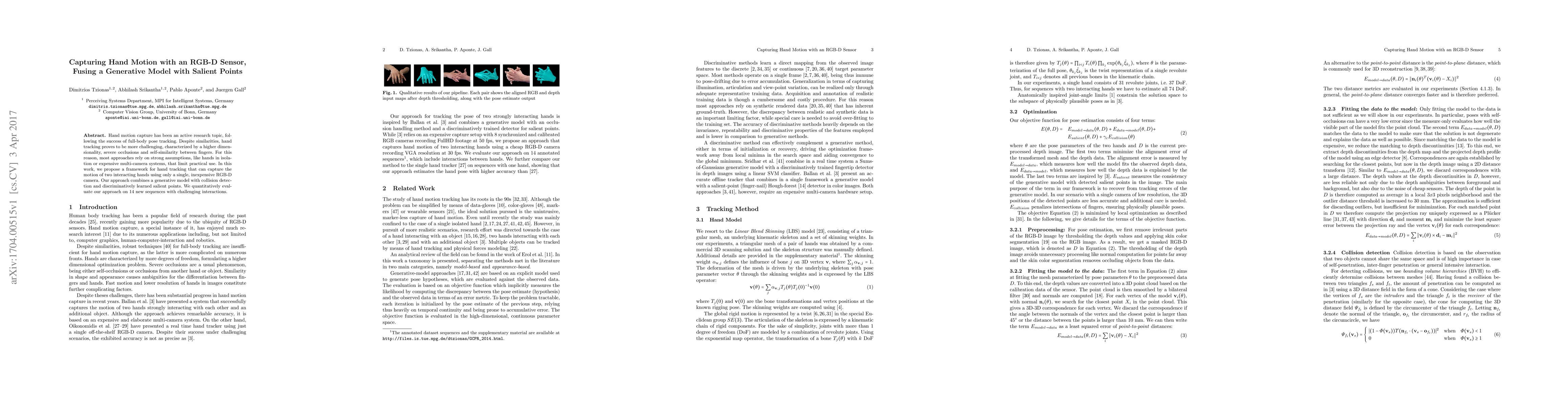 Hand motion capture has been an active research topic in recent years, following the success of full-body pose tracking. Despite similarities, hand tracking proves to be more challenging, characterized by a higher dimensionality, severe occlusions and self-similarity between fingers. For this reason, most approaches rely on strong assumptions, like hands in isolation or expensive multi-camera systems, that limit the practical use. In this work, we propose a framework for hand tracking that can capture the motion of two interacting hands using only a single, inexpensive RGB-D camera. Our approach combines a generative model with collision detection and discriminatively learned salient points. We quantitatively evaluate our approach on 14 new sequences with challenging interactions.