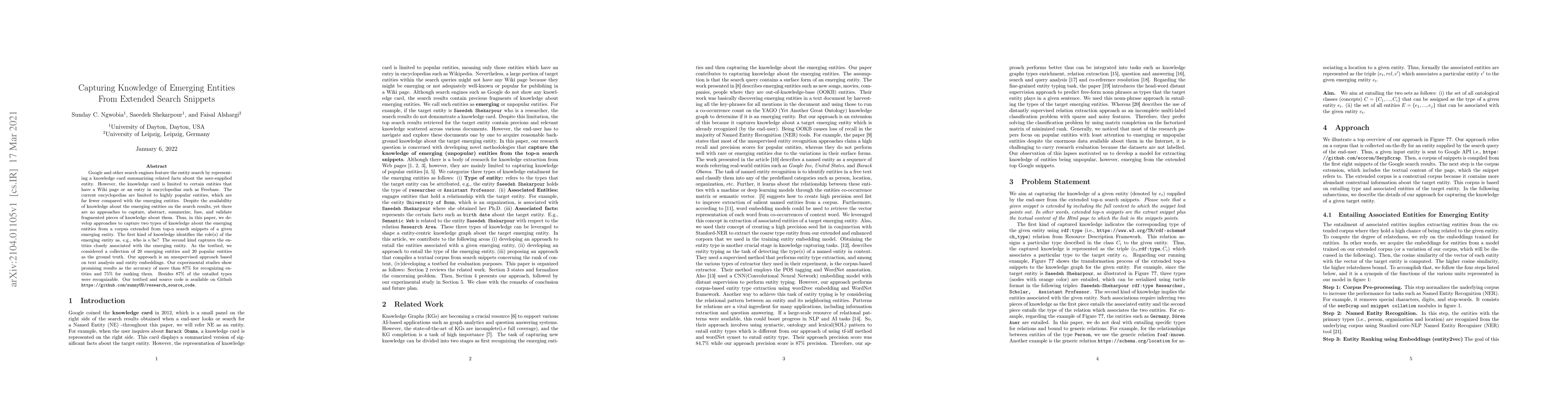 This paper develops unsupervised methods to extract and summarize knowledge about emerging entities from extended search snippets. The approach identifies roles and associated entities, achieving over 87% accuracy in entity recognition and 75% in ranking, with 87% of entailed types recognizable.