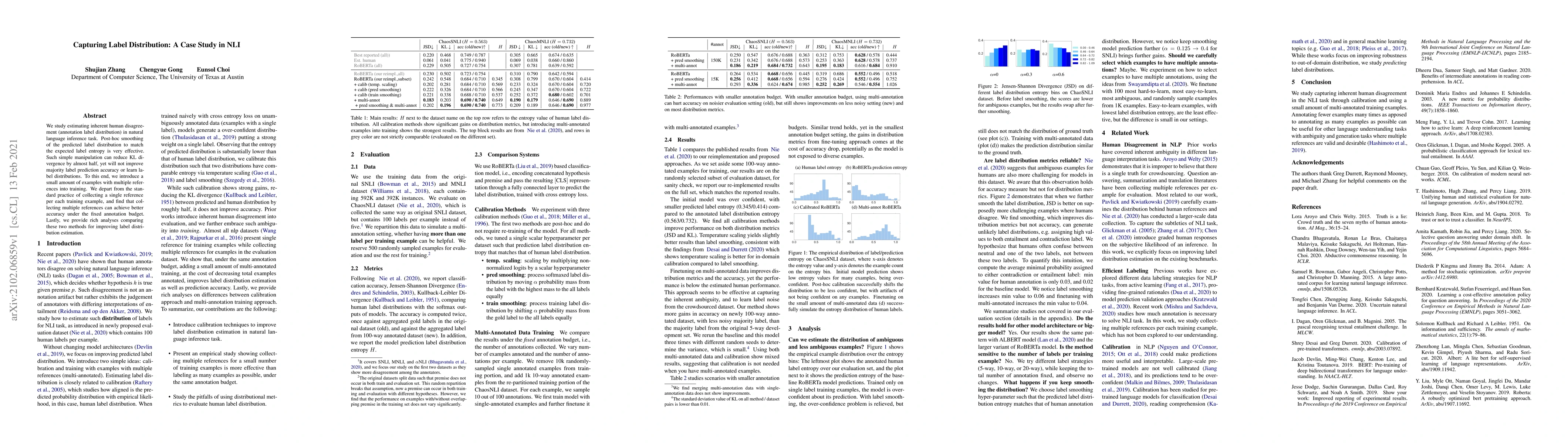 We study estimating inherent human disagreement (annotation label distribution) in natural language inference task. Post-hoc smoothing of the predicted label distribution to match the expected label entropy is very effective. Such simple manipulation can reduce KL divergence by almost half, yet will not improve majority label prediction accuracy or learn label distributions. To this end, we introduce a small amount of examples with multiple references into training. We depart from the standard practice of collecting a single reference per each training example, and find that collecting multiple references can achieve better accuracy under the fixed annotation budget. Lastly, we provide rich analyses comparing these two methods for improving label distribution estimation.