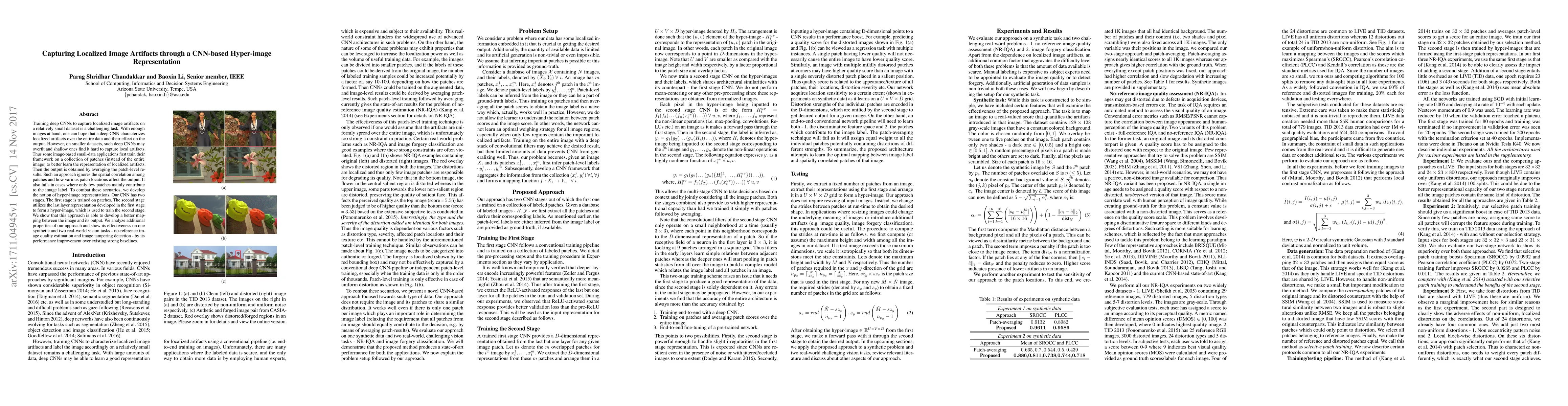 Training deep CNNs to capture localized image artifacts on a relatively small dataset is a challenging task. With enough images at hand, one can hope that a deep CNN characterizes localized artifacts over the entire data and their effect on the output. However, on smaller datasets, such deep CNNs may overfit and shallow ones find it hard to capture local artifacts. Thus some image-based small-data applications first train their framework on a collection of patches (instead of the entire image) to better learn the representation of localized artifacts. Then the output is obtained by averaging the patch-level results. Such an approach ignores the spatial correlation among patches and how various patch locations affect the output. It also fails in cases where few patches mainly contribute to the image label. To combat these scenarios, we develop the notion of hyper-image representations. Our CNN has two stages. The first stage is trained on patches. The second stage utilizes the last layer representation developed in the first stage to form a hyper-image, which is used to train the second stage. We show that this approach is able to develop a better mapping between the image and its output. We analyze additional properties of our approach and show its effectiveness on one synthetic and two real-world vision tasks - no-reference image quality estimation and image tampering detection - by its performance improvement over existing strong baselines.