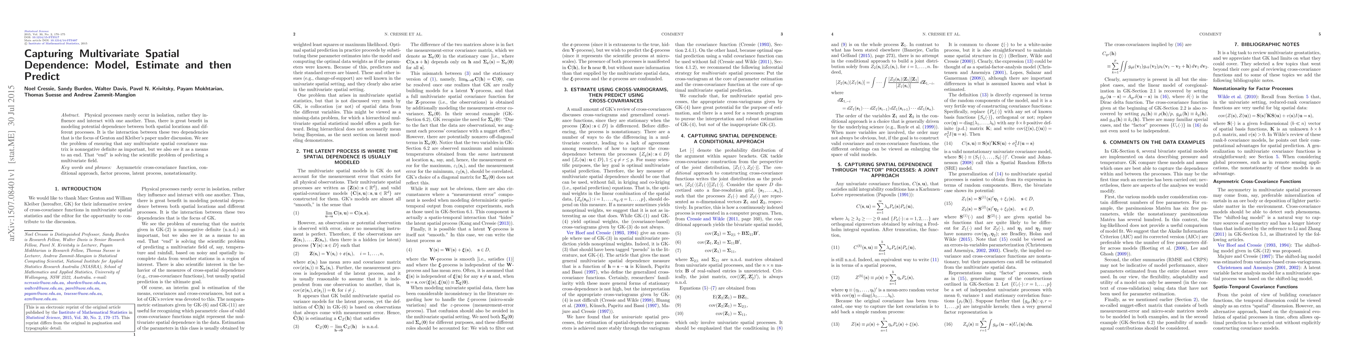 Physical processes rarely occur in isolation, rather they influence and interact with one another. Thus, there is great benefit in modeling potential dependence between both spatial locations and different processes. It is the interaction between these two dependencies that is the focus of Genton and Kleiber's paper under discussion. We see the problem of ensuring that any multivariate spatial covariance matrix is nonnegative definite as important, but we also see it as a means to an end. That "end" is solving the scientific problem of predicting a multivariate field. [arXiv:1507.08017].