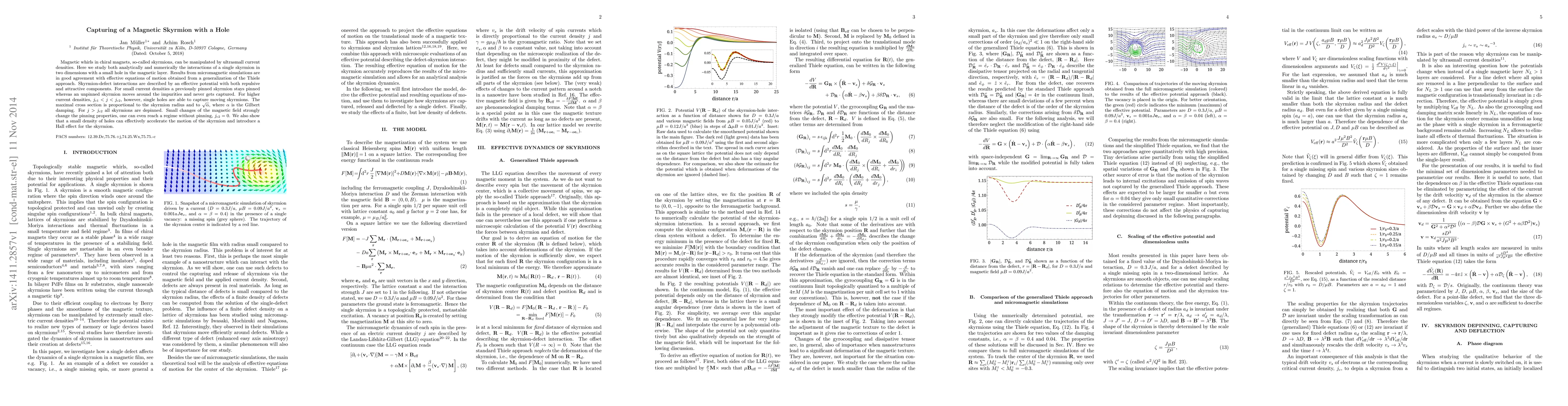 Researchers studied how a magnetic skyrmion interacts with a small hole in its layer when current is applied. For high enough currents, the hole can capture moving skyrmions, but for too low currents, it's repelled.