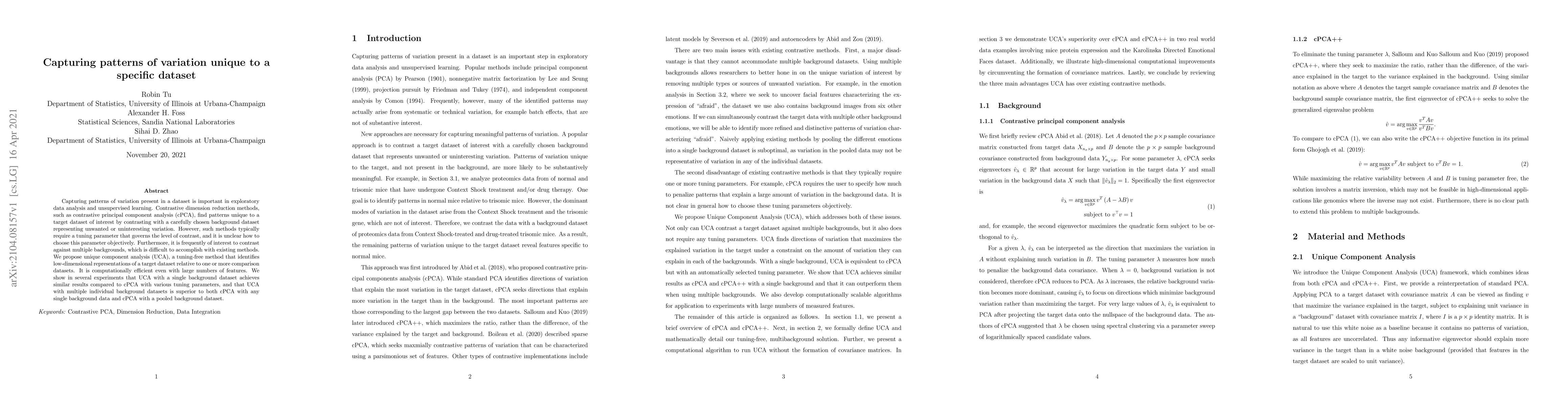 Researchers propose a new method called Unique Component Analysis (UCA) to identify patterns in datasets without requiring a tuning parameter. UCA outperforms existing methods like cPCA when contrasting against multiple individual background datasets.