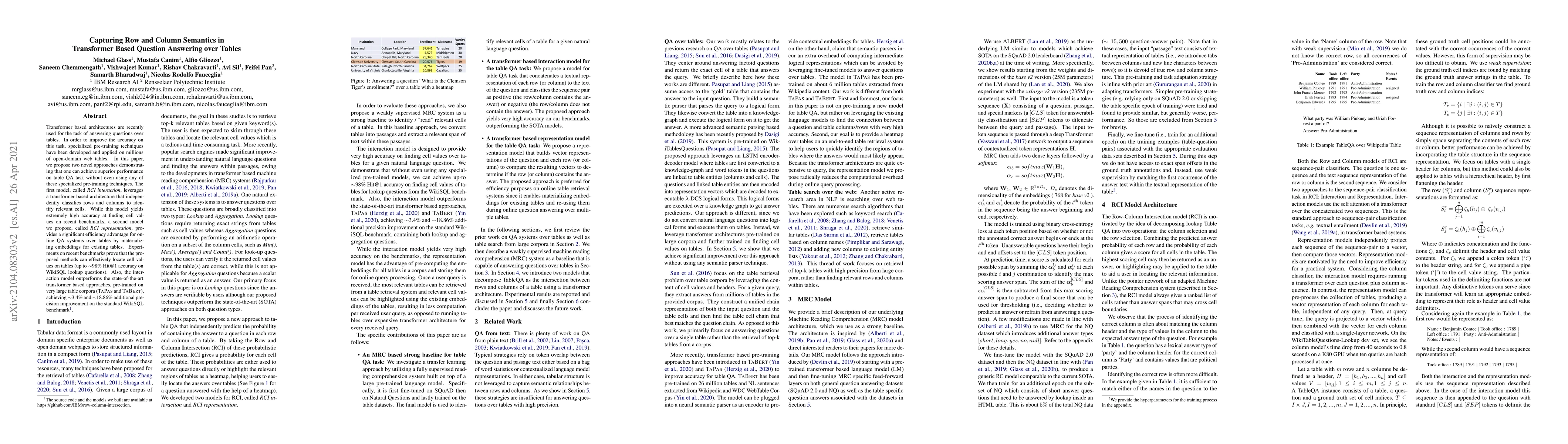 This paper introduces two novel transformer-based models for question answering over tables, achieving high accuracy (~98% Hit@1) without specialized pre-training. The first model, RCI interaction, independently classifies rows and columns to pinpoint relevant cells, outperforming existing transformer approaches by ~3.4% precision on the WikiSQL benchmark. The second model, RCI representation, enhances efficiency for online QA systems by materializing embeddings for existing tables.