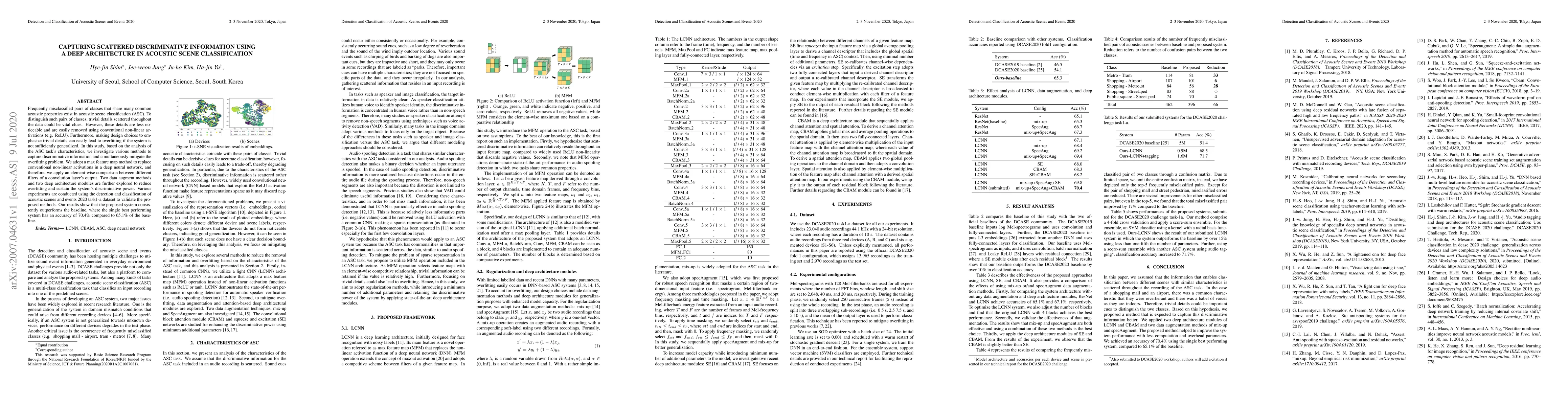 This paper proposes a deep neural network architecture to enhance the classification of acoustic scenes by capturing subtle discriminative details, addressing the issue of misclassification of similar classes. The method replaces conventional activations with a max feature map approach to retain critical details, supplemented by data augmentation and specialized modules to mitigate overfitting, achieving an accuracy of 70.4% compared to the baseline's 65.1%.