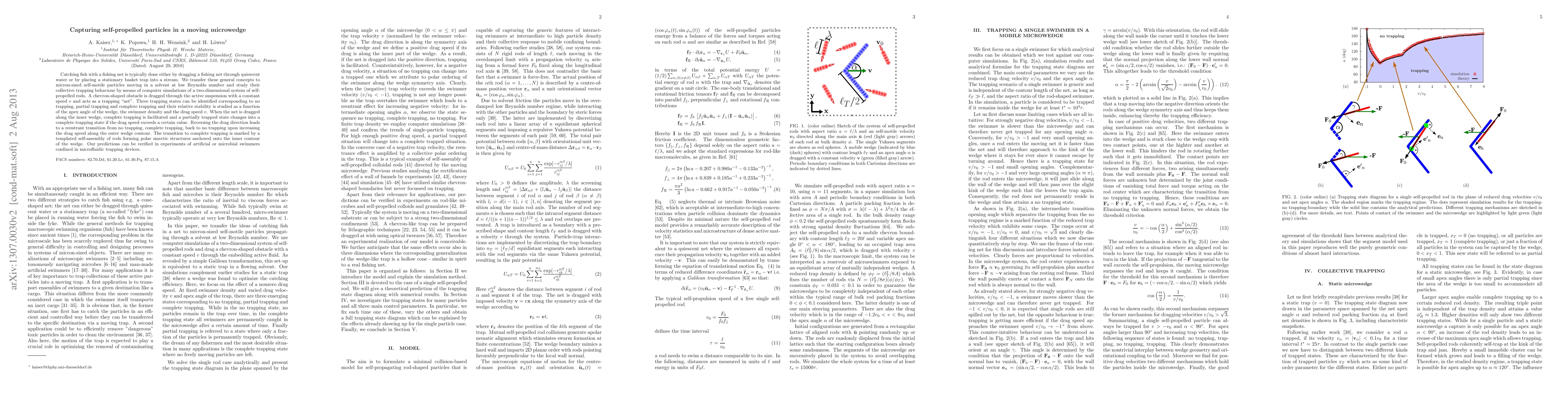 Catching fish with a fishing net is typically done either by dragging a fishing net through quiescent water or by placing a stationary basket trap into a stream. We transfer these general concepts to micron-sized self-motile particles moving in a solvent at low Reynolds number and study their collective trapping behaviour by means of computer simulations of a two-dimensional system of self-propelled rods. A chevron-shaped obstacle is dragged through the active suspension with a constant speed $v$ and acts as a trapping "net". Three trapping states can be identified corresponding to no trapping, partial trapping and complete trapping and their relative stability is studied as a function of the apex angle of the wedge, the swimmer density and the drag speed $v$. When the net is dragged along the inner wedge, complete trapping is facilitated and a partially trapped state changes into a complete trapping state if the drag speed exceeds a certain value. Reversing the drag direction leads to a reentrant transition from no trapping, complete trapping, back to no trapping upon increasing the drag speed along the outer wedge contour. The transition to complete trapping is marked by a templated self-assembly of rods forming polar smectic structures anchored onto the inner contour of the wedge. Our predictions can be verified in experiments of artificial or microbial swimmers confined in microfluidic trapping devices.