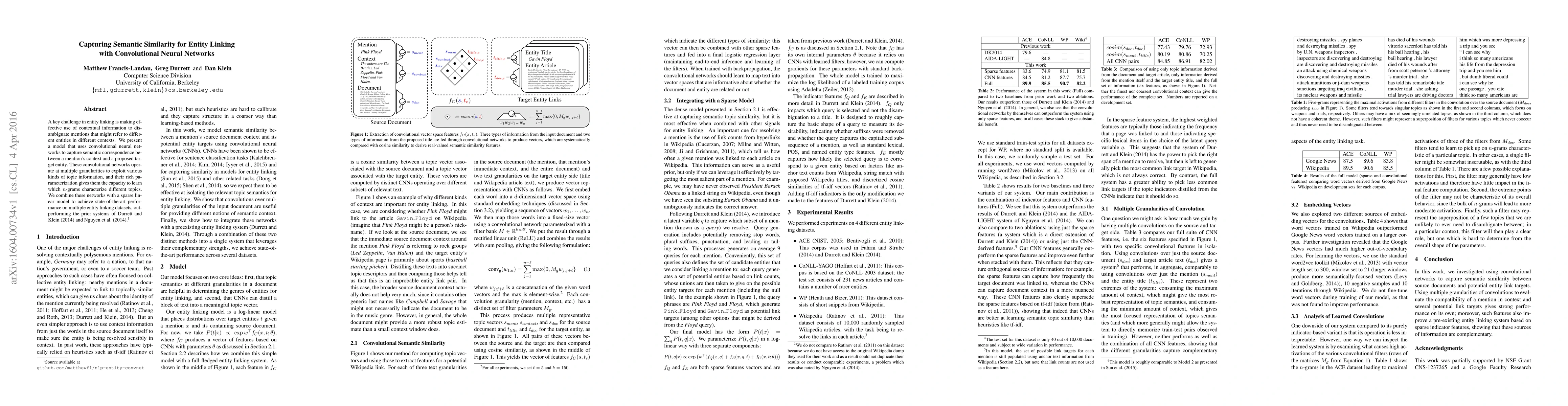 This paper proposes a convolutional neural network model to enhance entity linking by capturing semantic similarity between context and entity mentions. The model, combined with a sparse linear model, achieves top performance on various datasets, surpassing previous methods.