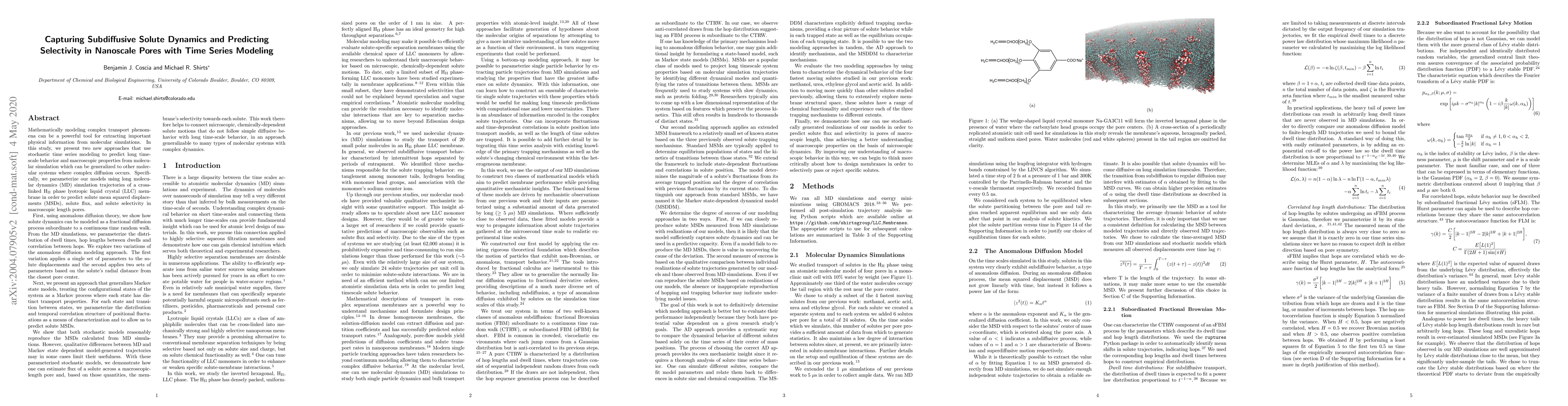 This paper models subdiffusive solute dynamics in nanoscale pores using stochastic time series models parameterized from molecular dynamics simulations. It uses anomalous diffusion theory and Markov state models to predict solute mean squared displacements, flux, and selectivity, bridging microscopic solute behavior with macroscopic membrane performance.