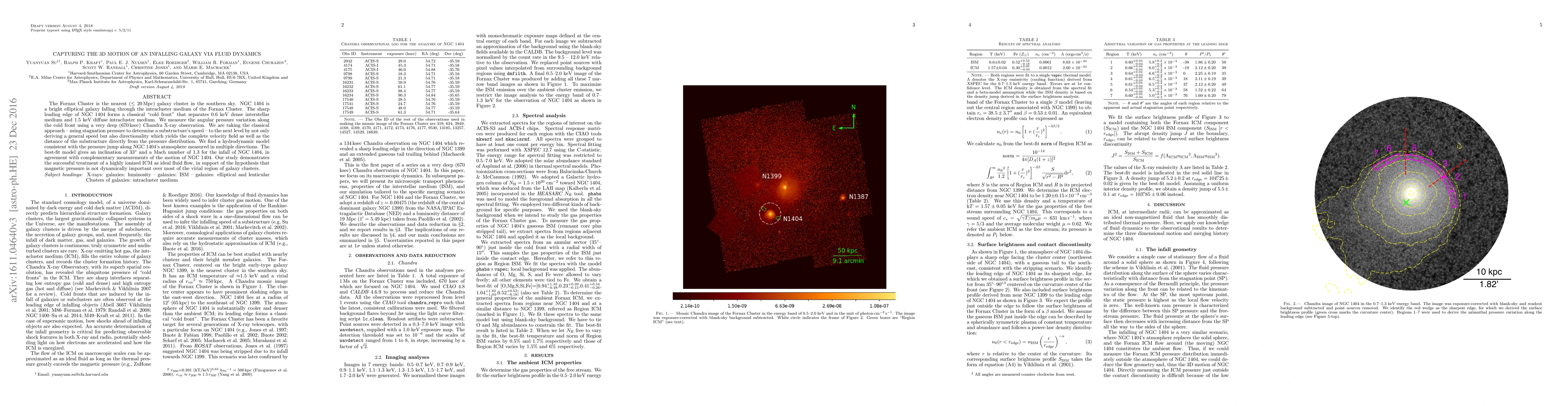 This paper uses deep {\sl Chandra} X-ray observations to measure the angular pressure variation along the cold front of NGC 1404, an elliptical galaxy falling into the Fornax Cluster, to determine its 3D motion. The study finds an inclination of 33$^{\circ}$ and a Mach number of 1.3, supporting the hypothesis that magnetic pressure is not dynamically significant in the intracluster medium.