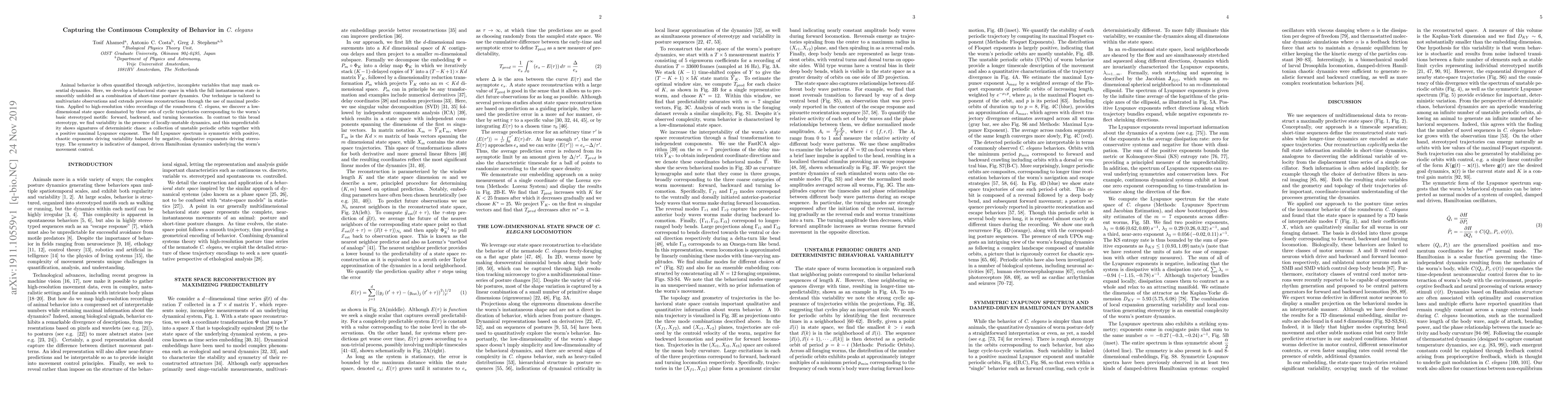 Animal behavior is often quantified through subjective, incomplete variables that may mask essential dynamics. Here, we develop a behavioral state space in which the full instantaneous state is smoothly unfolded as a combination of short-time posture dynamics. Our technique is tailored to multivariate observations and extends previous reconstructions through the use of maximal prediction. Applied to high-resolution video recordings of the roundworm \textit{C. elegans}, we discover a low-dimensional state space dominated by three sets of cyclic trajectories corresponding to the worm's basic stereotyped motifs: forward, backward, and turning locomotion. In contrast to this broad stereotypy, we find variability in the presence of locally-unstable dynamics, and this unpredictability shows signatures of deterministic chaos: a collection of unstable periodic orbits together with a positive maximal Lyapunov exponent. The full Lyapunov spectrum is symmetric with positive, chaotic exponents driving variability balanced by negative, dissipative exponents driving stereotypy. The symmetry is indicative of damped, driven Hamiltonian dynamics underlying the worm's movement control.